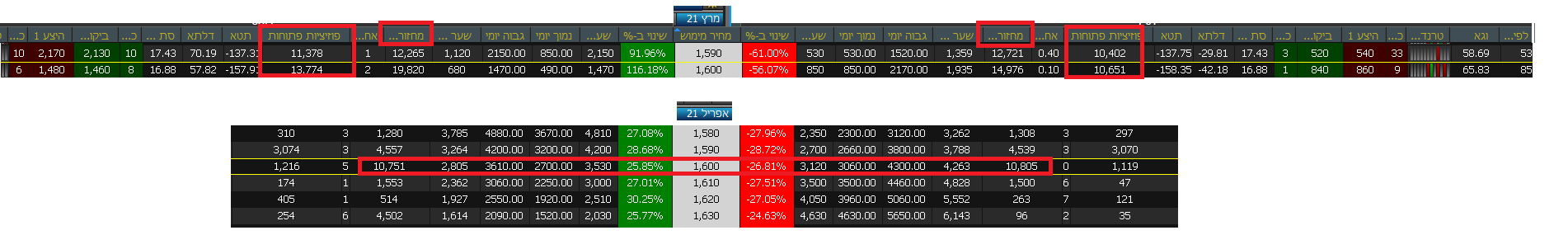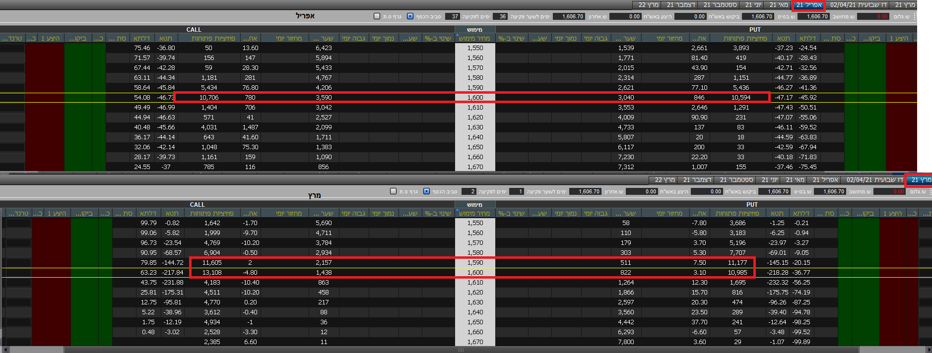 סביב 1600 היום לחודש הבא, כ 10K לכיוון והיטו כאמור למעלה עפ"י הצפי. יש פקיעה חודשית החודש. כל איזור 1590-1600 היו גילוגלים קודמים וחזרנו לאותו איזור פה. מעריך ביום רביעי נראה באיזור 7-8K כתיבות לפחות בסטרייק הזה 1600 לחודש הבא. יש גם מחזורים גבוהים על הסטרייקים האלו בהתאם לחודש הנוכחי. מה יהיה לאחר הבחירות והאם תהיה לנו תנועה חדה, הכל יכול להיות. נכון לרגע זה נמצאים בדיוק באמצע 1600 ויכולים לדרוך פה5-8 נק+-. מניח שיהיה אקו ברביעי ותלוי הבחירות, כמה עצמה וכול, קשה לדעת במצבים הלו. נשאר בגדול רק יום מסחר אחד. 1580-1620 לערך הטווח אם ניקח קצת מעבר. סטיות פה 15-17~ לערך. די דרכו ברמה חודשית כאשר באמצע לקחו תנועה של 80-120 נקודות. נבדוק ברביעי, המשך יום נעים לכולם.