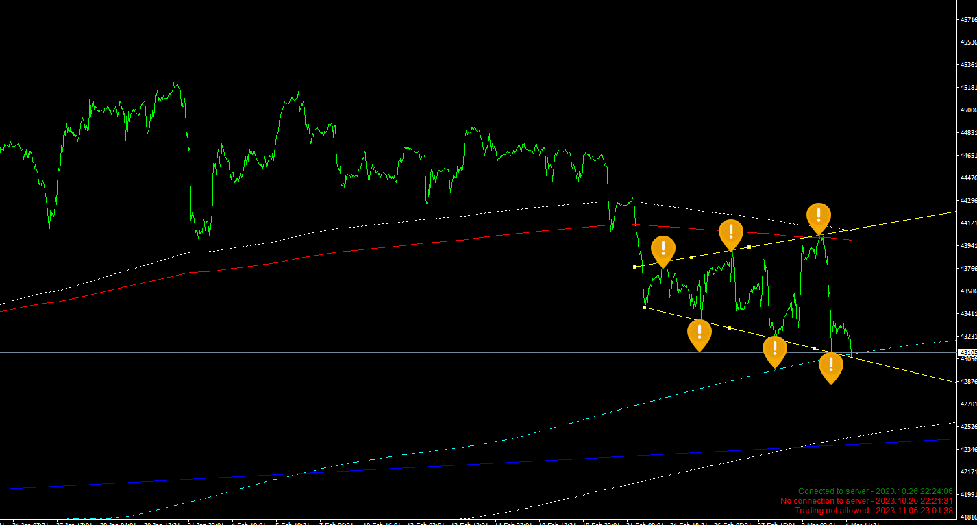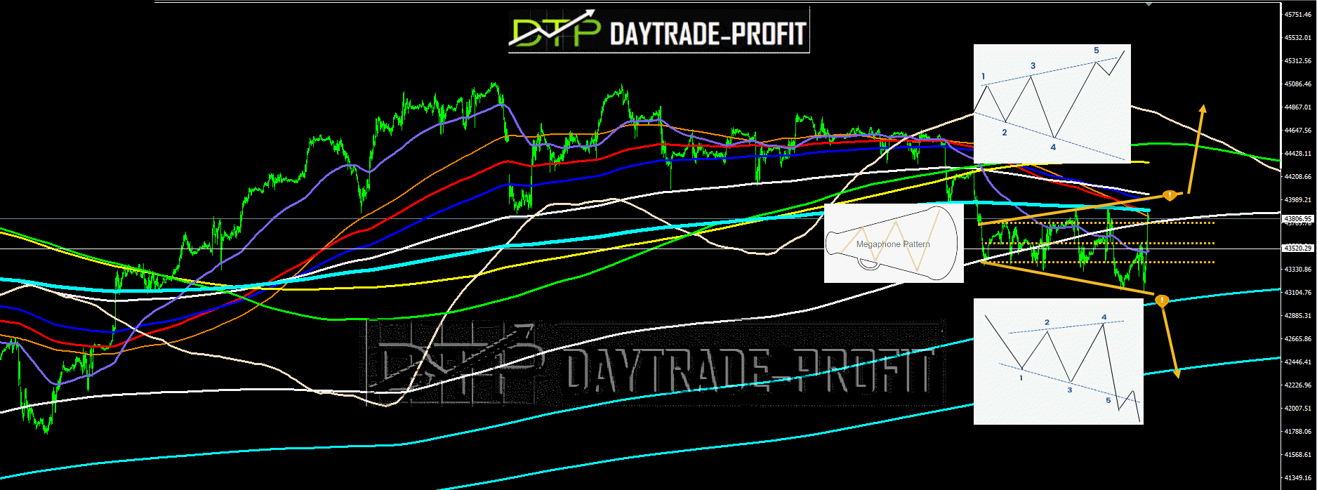 תבנית המגפון נחשבת לתבנית המשך ניטרלית, עם פוטנציאל הפוכה וגם שלילי. התנודתיות המתרחבת הופכת את הטיית הכיוון לבלתי ברורה, שבירה מעל קו המגמה העליון מסמנת רזולוציית הפוך וכניסה ללונגים, בעוד שצניחה מתחת לקו המגמה התחתון מאותתת על רזולוציה דובית עבור שורטים. בחוזה גבול עליון אזור 44100 גבול תחתון אזור 43100 למי שמחפש אישור לתנועה