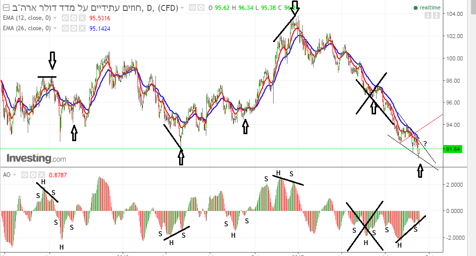 קודם כל נתמך כרגע בנר החודשי הנוכחי על 91.38 שזה תיקון 50 של תנועה אחרונה מ 78.93 ל 103.81 , וממש על סף חזרה מעל 91.88 תמיכה אופקית חשובה מאוד לאחר שכבר ביקר ב 90.99 . עכשיו למתנד ה AWESOME OSSCILATOR , שפירושו בתרגום חופשי הוא המתנד האדיר . פששש איזה שם מפוצץ , אבל אם תסתכלו עליו , הוא באמת אדיר . הוא צופה מהפכים ולא סתם אלא בצורת תבניות של ראש וכתפיים . מתוך 6 תבניות אחרונות , הוא פגע ב 5 , נתון מדהים. לחדי העין יש שם תבנית וולף שוורית שכרגע בתהליך של תיקון לתוך היתד , צריך אבל פריצה