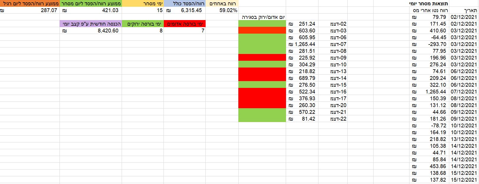 האם ידעתם שב 1590 ימי המסחר? : רק ב - באחוז אחד מהמקרים (18 ימי מסחר) המדד לא עלה בכלל מרגע פתיחת המסחר ב 91% מהמקרים (1446 ימי מסחר) המדד הגיע לפחות לעלייה של 0.12% מרגע פתיחת המסחר ב 84% מהמקרים (1330 ימי מסחר) המדד הגיע לפחות לעלייה של 0.20% מרגע פתיחת המסחר חמוש בנתונים האלו, החלטתי בתחילת דצמבר לנסות לסחור על בסיס "קנה בפתיחה מכור ברגע ההצלחה" מצרף את דוח המצ"ב העדכני. במידה ויש עניין אמשיך לשתף גם בהמשך עריכה: נכנסתי בסכומים קטנים מאוד אבל עם מינוף פסיכי