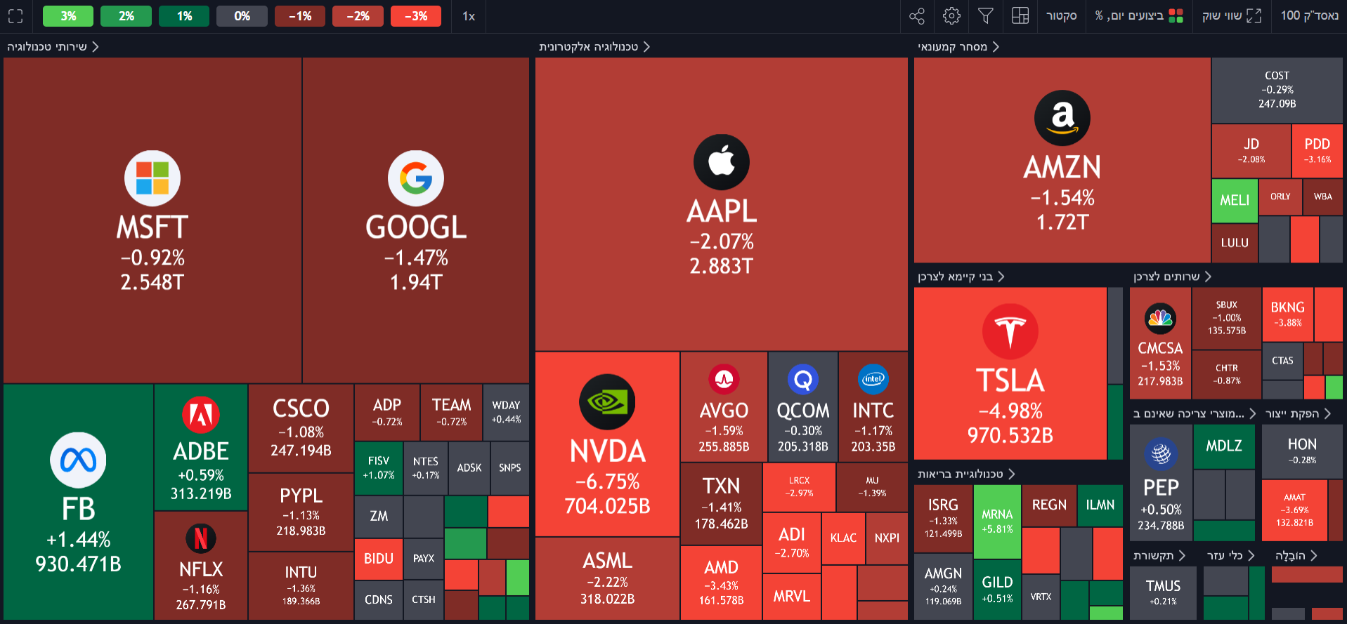 הנאסדק הפך אדום לאחר פתיחה ירוקה, הדאו והאם אנד פי 500 עולים עד 0.5%, T עולה 5% לאחר הודעה על חלוקת דיבידנד של 0.5 דולר, אדובי נופלת 7.5%