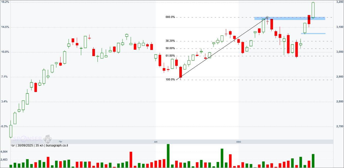 מדד ת”א 35 סגר את שבוע המסחר בעליה של 5.44% וננעל ברמה של 3,199.82 נקודות. המדד פתח את השבוע האחרון בסערה ובפער מחירים עולה, יום שני של השבוע היה מהוסס יותר עם פתיחה מעל השיא וסגירה שלילית קלה, ביום שלישי השוק טס מעל לשיא עם עליה של קרוב ל-3%. טכנית, השוק יוצר שיא חדש מעל לגבוה האחרון כשהוא פותח יעד עולה קצר טווח לאזור של 3,250 נקודות שכבר דיי קרוב למיצוי. תמיכה קרובה קיימת סביב פער המחירים שנפתח ברמה של 3,072 נקודות.
