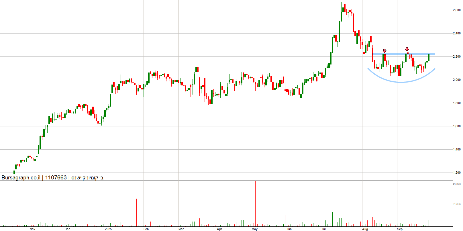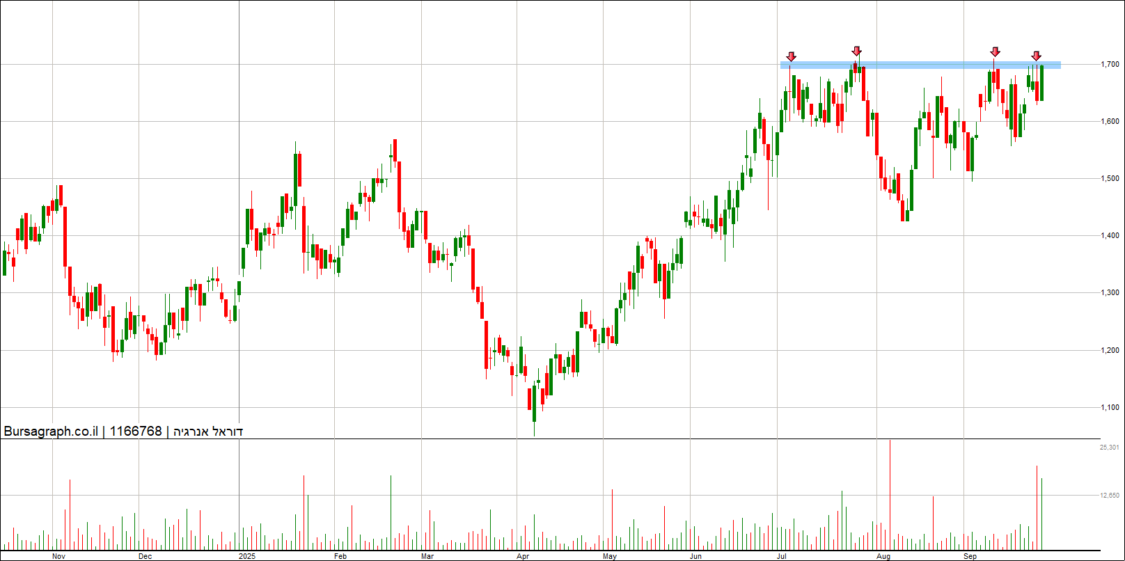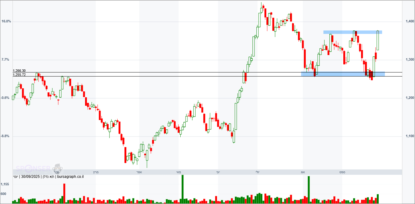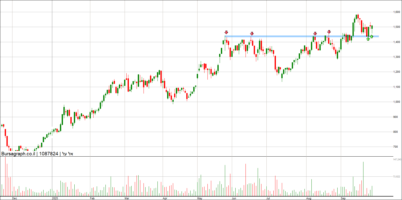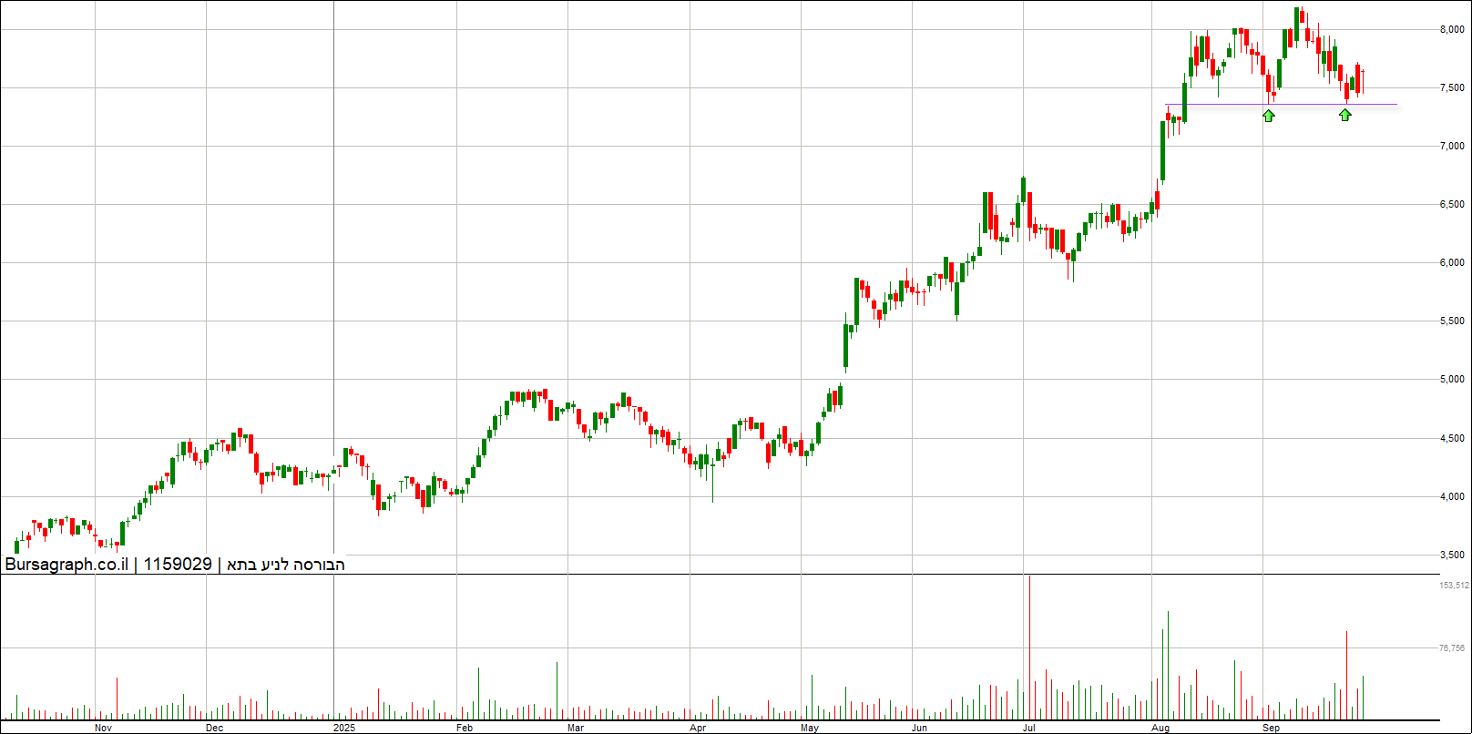 מניות החברה נסחרות במדד ת”א 90. המניה פרצה לפני מספר שבועות את אזור ההתנגדות האופקי/שיא סביב 1,435-1,445 נקודות ולאחר שהמשיכה לטפס עד לאזור 1,580 נקודות ומאז נסוגה חזרה לאזור הפריצה ומתבססת מעליו. ביום המסחר האחרון המניה התהפכה מירידה לעליה במחזור מסחר גבוה אשר עשוי להוות טריגר לסיום ההתבססות והמשך המגמה העולה כאשר פריצה וסגירה מעל 1,580 נקודות תאשרר את המשך המגמה עם יעד קרוב סביב 1,720 נקודות.