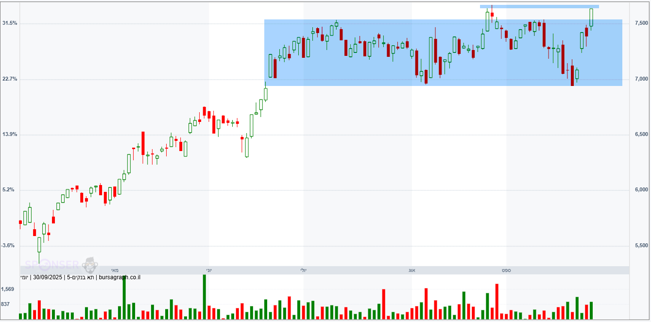מדד הבנקים סגר את שבוע המסחר בשפיץ שבועי וגבוה חדש על בסיס שערי סגירה. הגבוה מחודש אוגוסט סביב 7,641/71 נקודות סביר שייבדק ביום המסחר הבא. תמיכה קרובה כאן קיימת גם כן בפתח פער המחירים מראשון האחרון סביב 7,240 נקודות. אם אפשר להתנבא אני מעריך שנראה חזרה של המדד לתוך טווח המסחר.