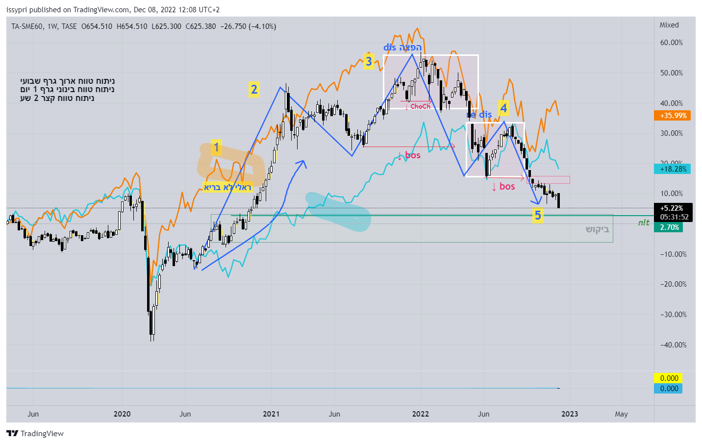 שבועי חוזר על הסקירה הקודמת שנתתי 1 - ראלי לא בריא 2 - תנועת צד - איסוף מחדש 3 - הפצה 4 - הפצה מחדש 5 - כעת, המשך תנועה יורדת אחרי בלימה. כמו שזה נראה בדומה לנדלן והבניה, מדד הSME להבדיל מ 35 והבנקים עשה דרך למטה שנראה שהיעד הוא היציאה מV הקרונה (רצועת הביקוש) להשוואה חוזי הסנופי (כתום)' תא 35 בתכלת - רואים שהסנופי קרוב למקום הזה (מרקר כתום) ותא 35 עדיין רחוק משם (מרקר תכלת). כשתהיה התאוששות / תיקון משמעותי אני מאמין שנראה קודם כל את המדדים שהגיעו ליעד הזה מתקנים יותר מאלו שעדיין לא וייתכן שאף נראה מגמות הפוכות.