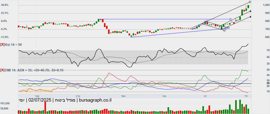 1000 במונחי סגירה,היעד הבא 1050,המהווה את קצה התעלה בטווח הארוך,ואל שיא כל הזמנים. פורצת במחזור מאד גבוה ובהתאמה לשבועות האחרונים.
