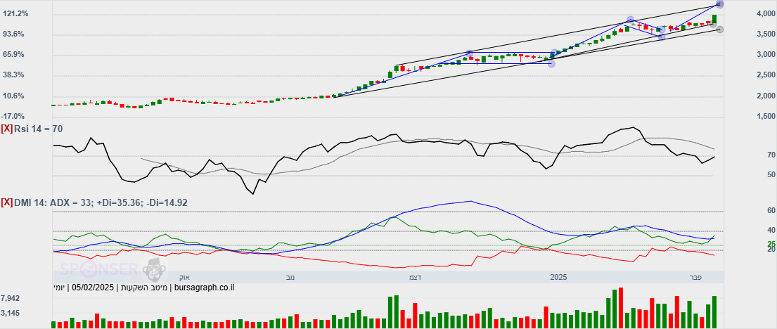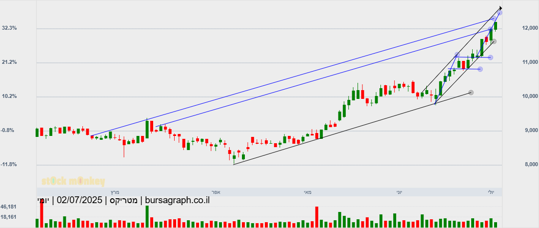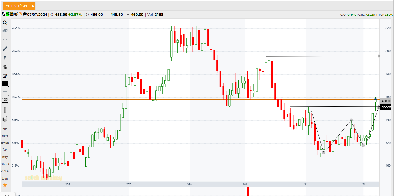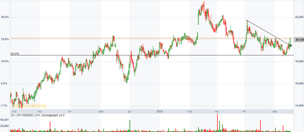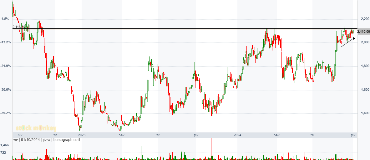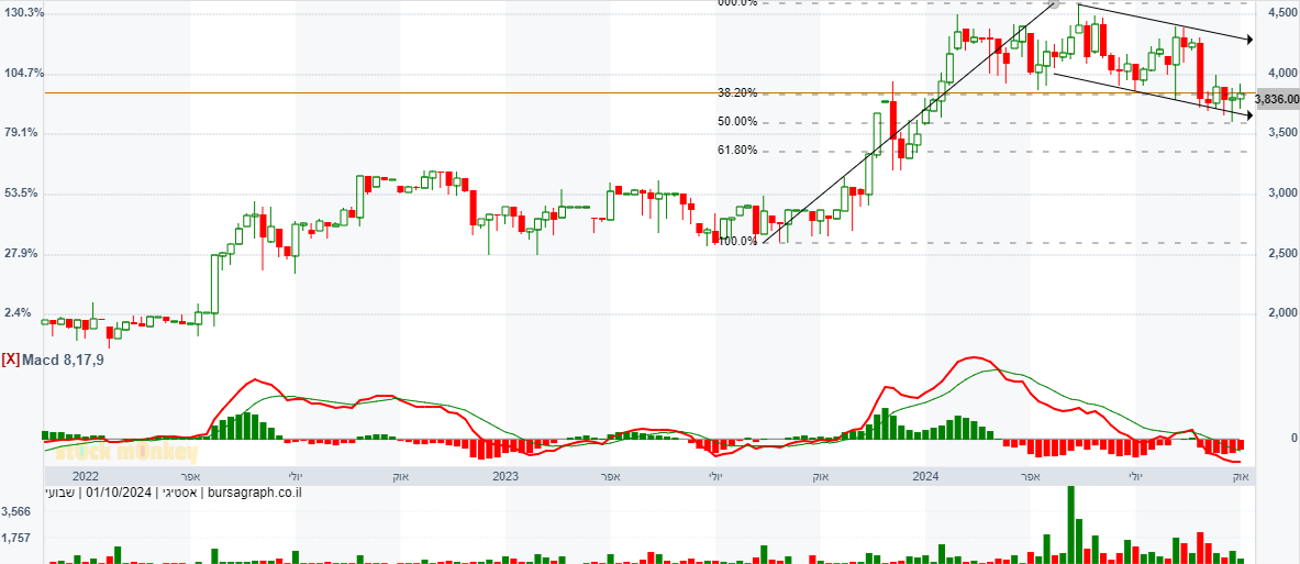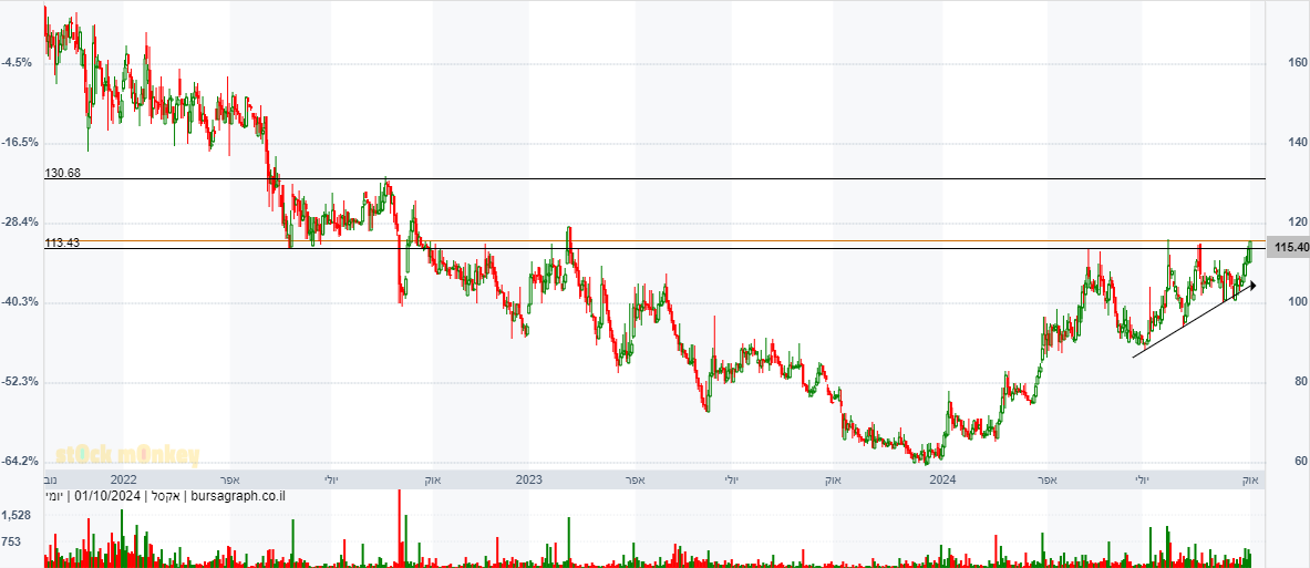 עולה מינורית,כשמגרדת גבוהית שנתית חדשה,והכי חשוב שעשתה זאת במחזור עוצמתי אחד מהגבוהים שנקבעו השנה, קרוב ל 145 מליון ש,אבל הנגיעה בקצה התעלה המינורית,אולי מרמזת על יציאה למימוש כבר לשבוע הבא ,מהסיבה שעלתה באחוזים ניכרים בחודשים האחרונים,ובהתאמה לחברות הביטוח הגדולות,ולכן יש מקום להערכתי לממש 50% מהאחזקה ולשים רווחים יפים בחשבון העוש!!