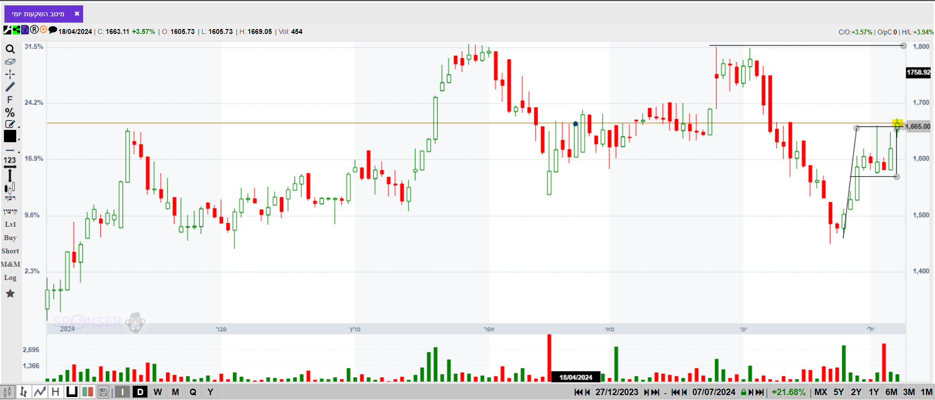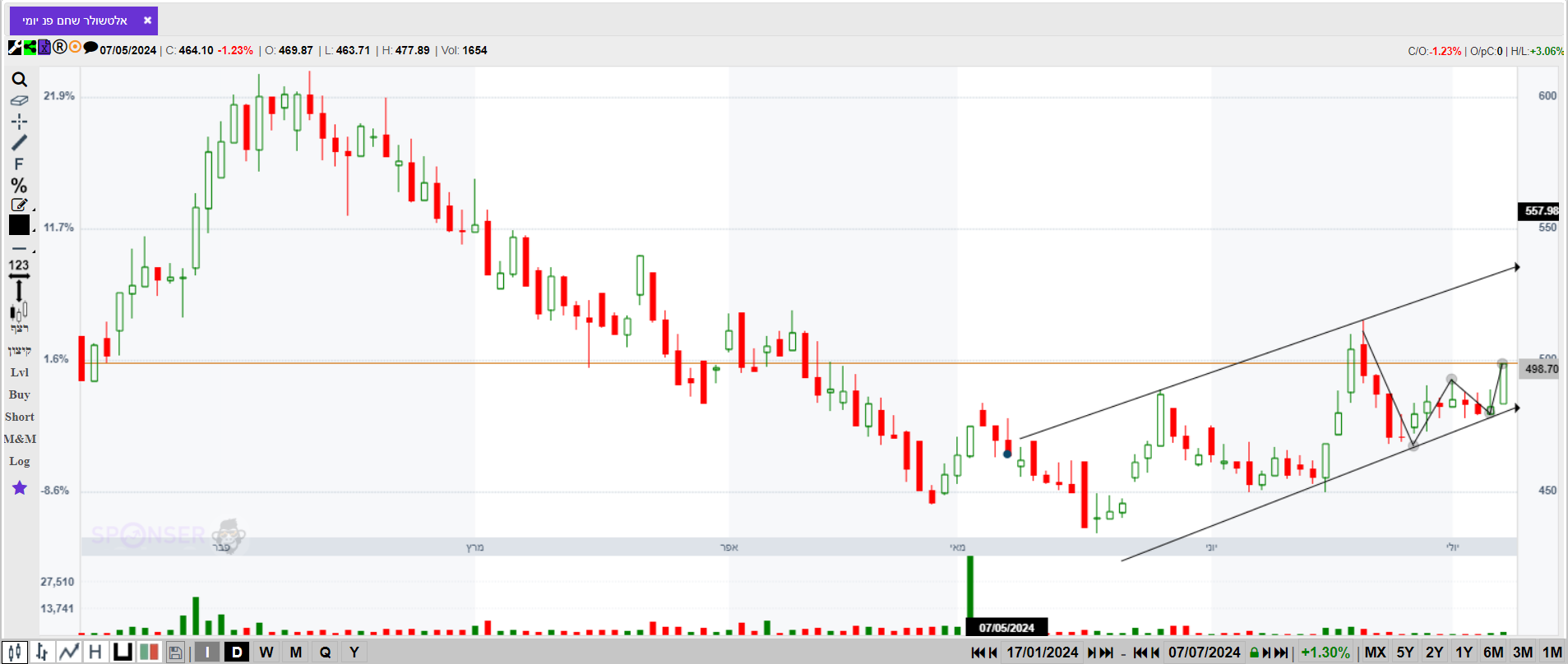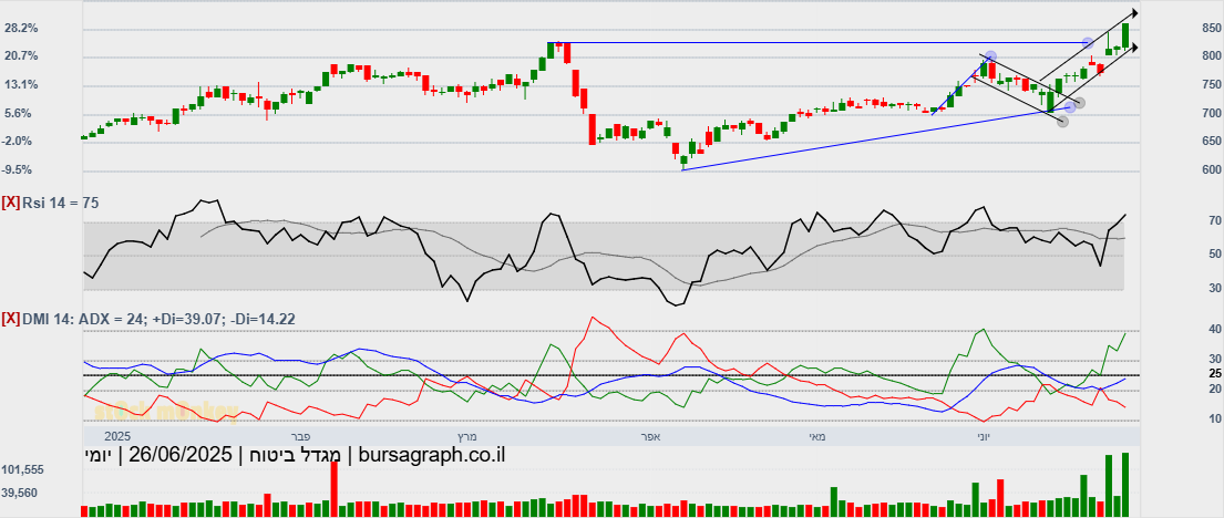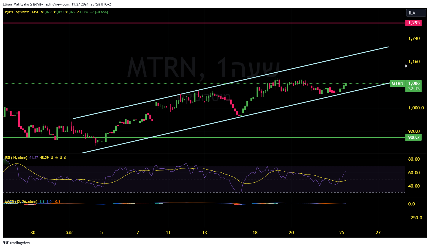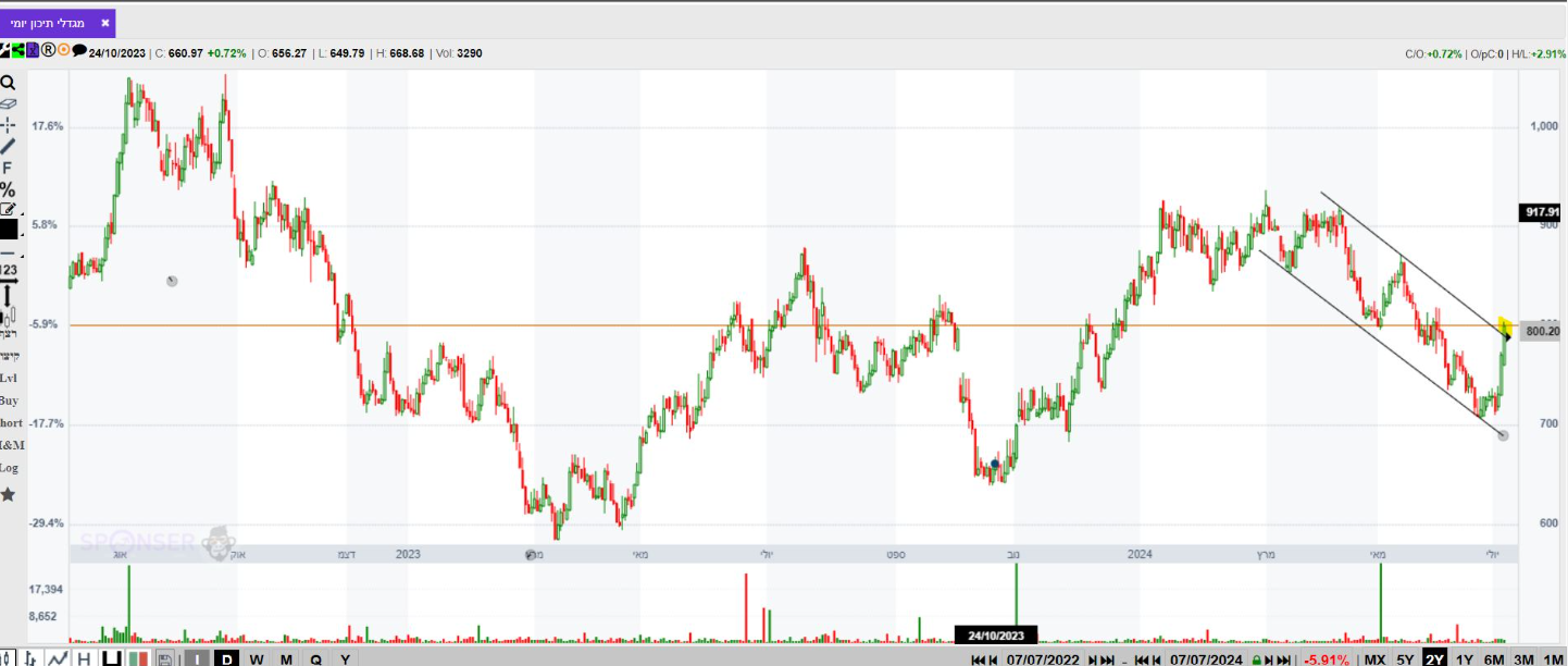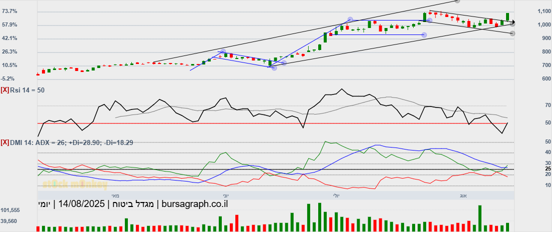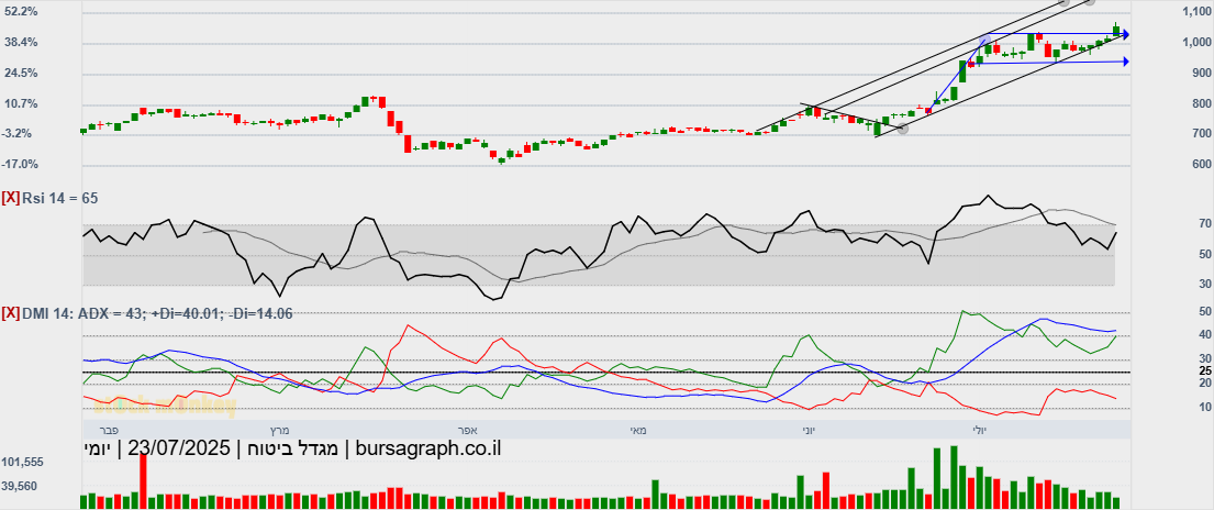 דגלים רצופים,יצאה למימוש קל מאד,וזאת לאחר שעלתה ברציפות כמעט שנה,פרצה היום המניה תעלה יורדת ,ובמחזור גבוה מאד,כשבמונחי סגירה מנגבת את גבוה כל הזמנים,כשהיעד הבא שעשוי להתנגד 1100,ועם גיבוי לעליה מהמתנדים המהירים,כשה RSI ,עומד על 50,משמצביע על חזרתו של המהלך השורי.וכמו כן רחוקים מאד מקצה התעלה העולה בטווח הארוך!