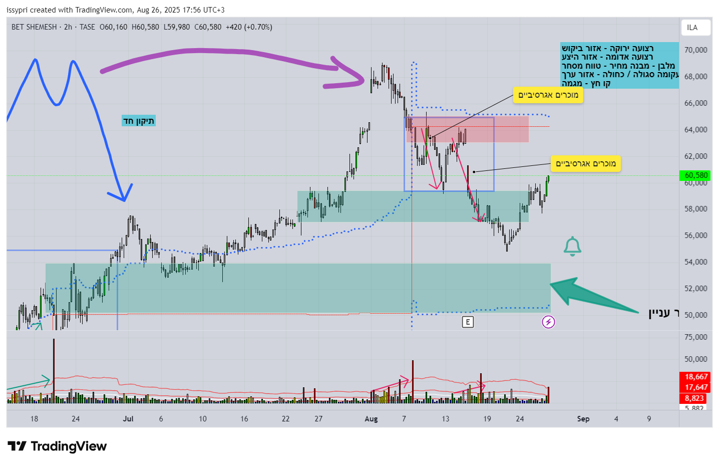 חזקה סביב 60000,ונכנס גם מוכר גדול סביב נק' זו, אולם ברגע שתיפרץ הנק',היא תמשיך בעליה צפונה ובהמשך המגמה השורית.🙇