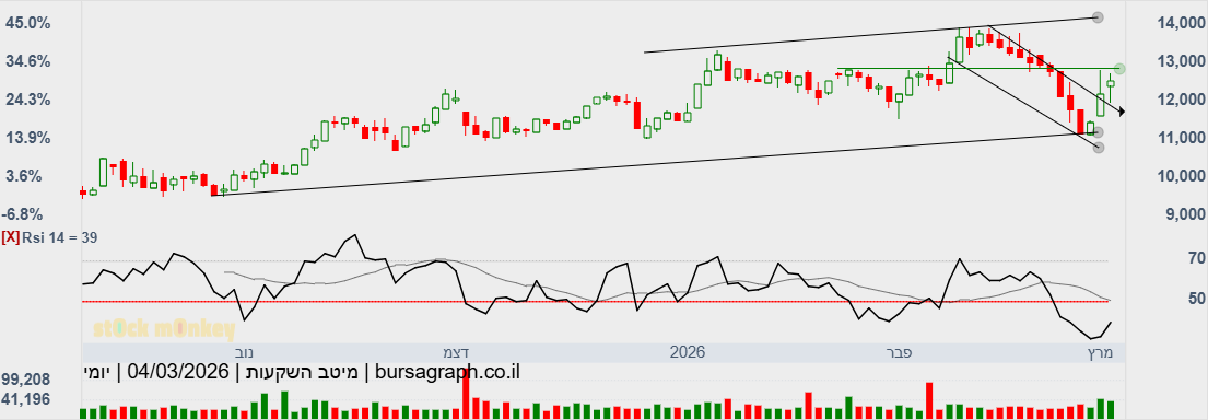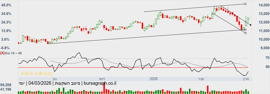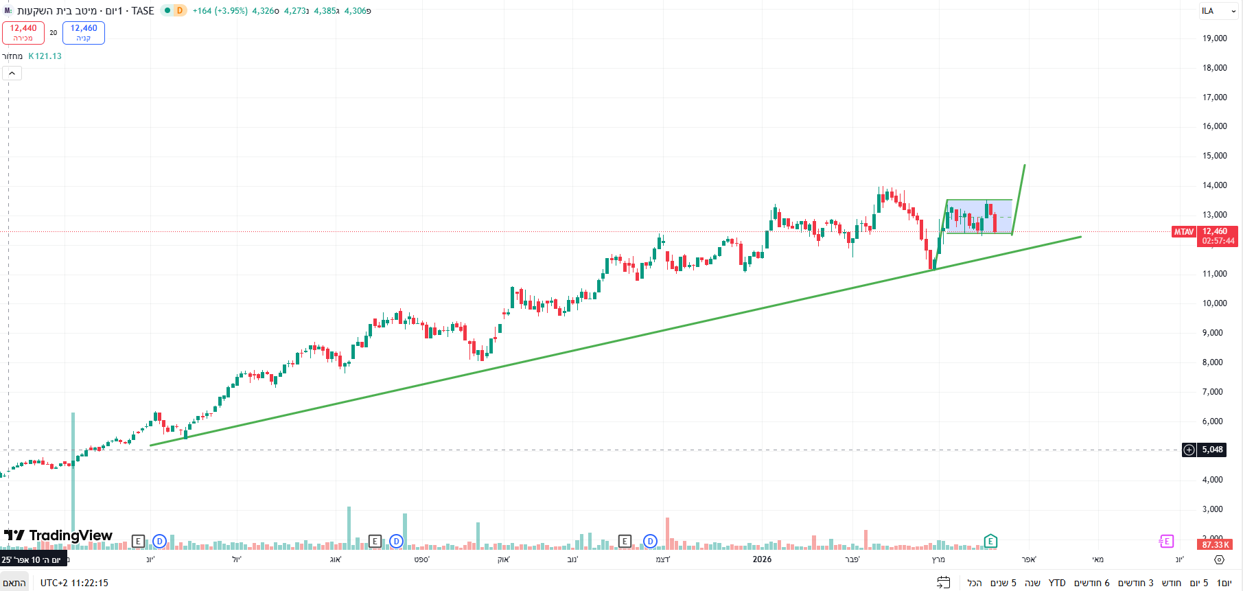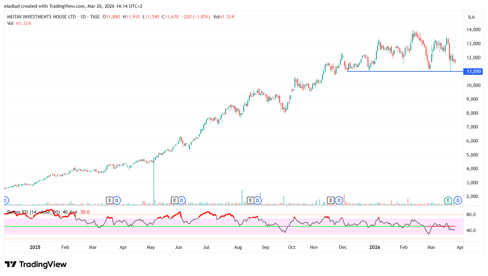 טרם הפתיחה.בית ההשקעות מיטב החליט סוף סוף להיתהפך ,אחרי מימושים יחסית חדים מאד כמעט לאורך כל הרבעון הראשון של 2026,ואולי לחץ של המשקיעים והזרים הכריעו את השינוי.נכון לעכשיו 12000 מהווה התנגדות להמשך המגמה,כשרק פריצה מעליה עשויה לדחוף חזרה אל קצה התעלה המינורית היורדת-13200.🤞