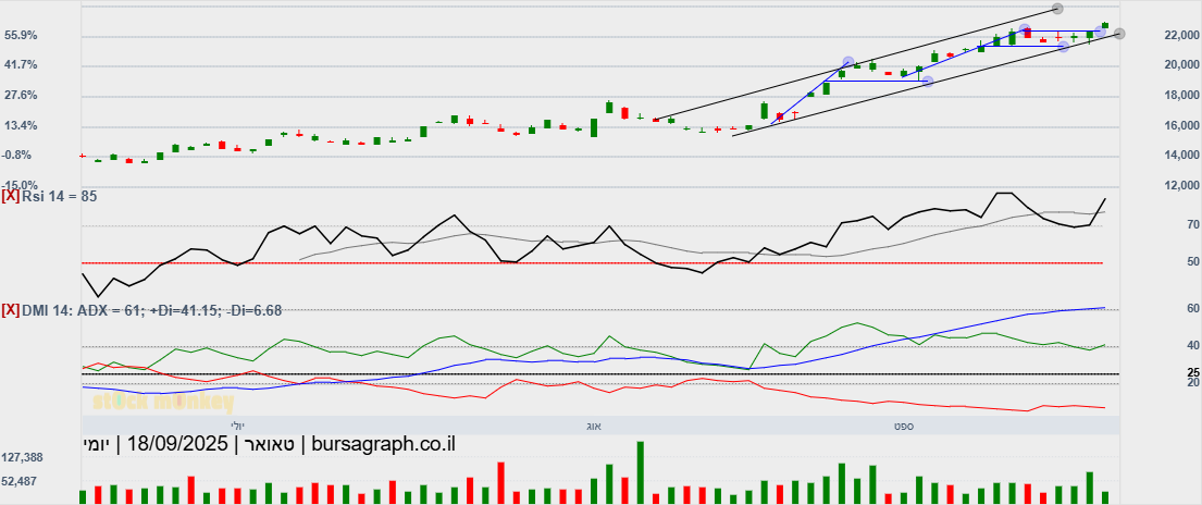 מספר ימים של עליות חדות גם בת"א,וגם בנסדק,וניגובים של שיאים שנתיים חדשים,התממשה המניה ביום המסחר האחרון ב4.5%,ובמחזור גבוה מאד של מעל ל 110% מהממוצע התלת חודשי,וסגרה למרות המימוש החד בארביטראג' של 2.2% חיובי,ובשער של-24000,כשהיעד לע"ד הוא קצה התעלה המינורית הירוקה שעומד על25850,ומהווה בהתאמה גם את יעד הדגל,הערכתי אחרי חוסר של שלושה ימי מסחר בת"א!😱