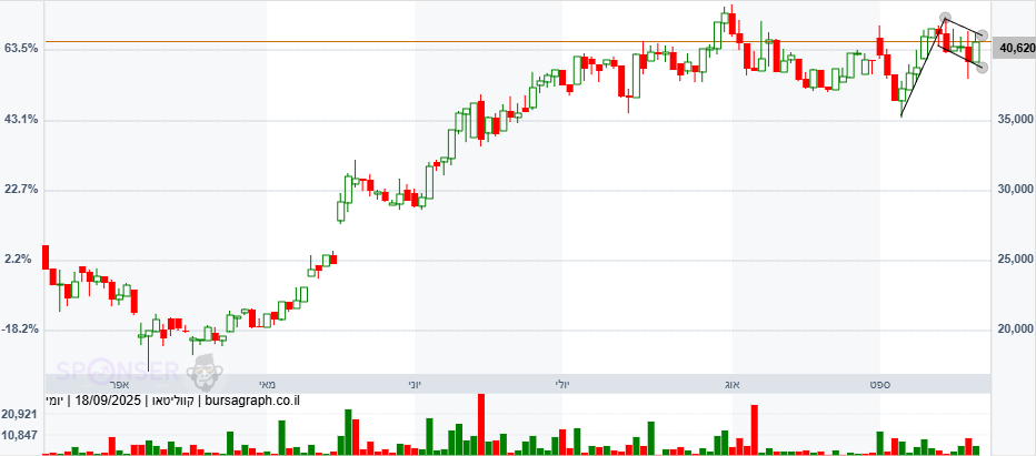 כמעט קרוב לשיא,ובמחזור מאד גבוה שעבר את ה 150%,ומחר יום לפני הפקיעה השבועית,וביום חמישי של הפקיעה,אולי נקבל פריצה של הדגל ,אולם מעבר לים עם השפעה חיובית לכיוון טאואר בת"א.🙏