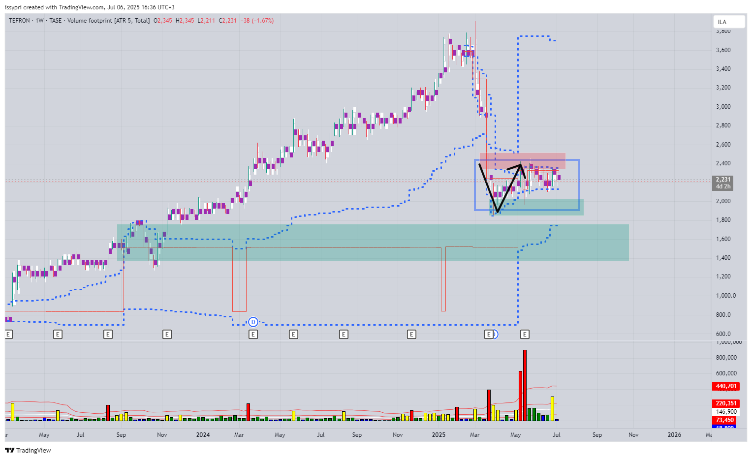 יש בלימה V ואינטרקציה גבוה בין מוכרים לקונים (מחזורים כללית גבוהים). המוכרים נמצאים ברצועה האדומה בלימיטים ומשם הם יוצאים במרקט (שנגמרים הקונים). גם הנר של שבוע שעבר שהיה עם ווליום גבוה יחסית, נבלם בהיצע. לי זה נראה יותר כמו הפצה מחדש (דגל דובי) לעוד לג לאזור 1400-1600. אבל זה לא בטוח. נראה איך המחיר יגיב ברצועה הירוקה הקרובה.