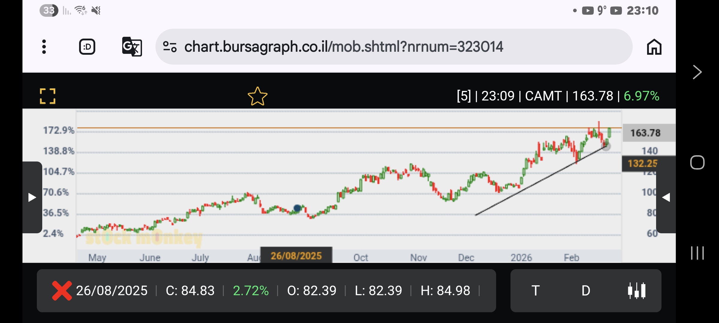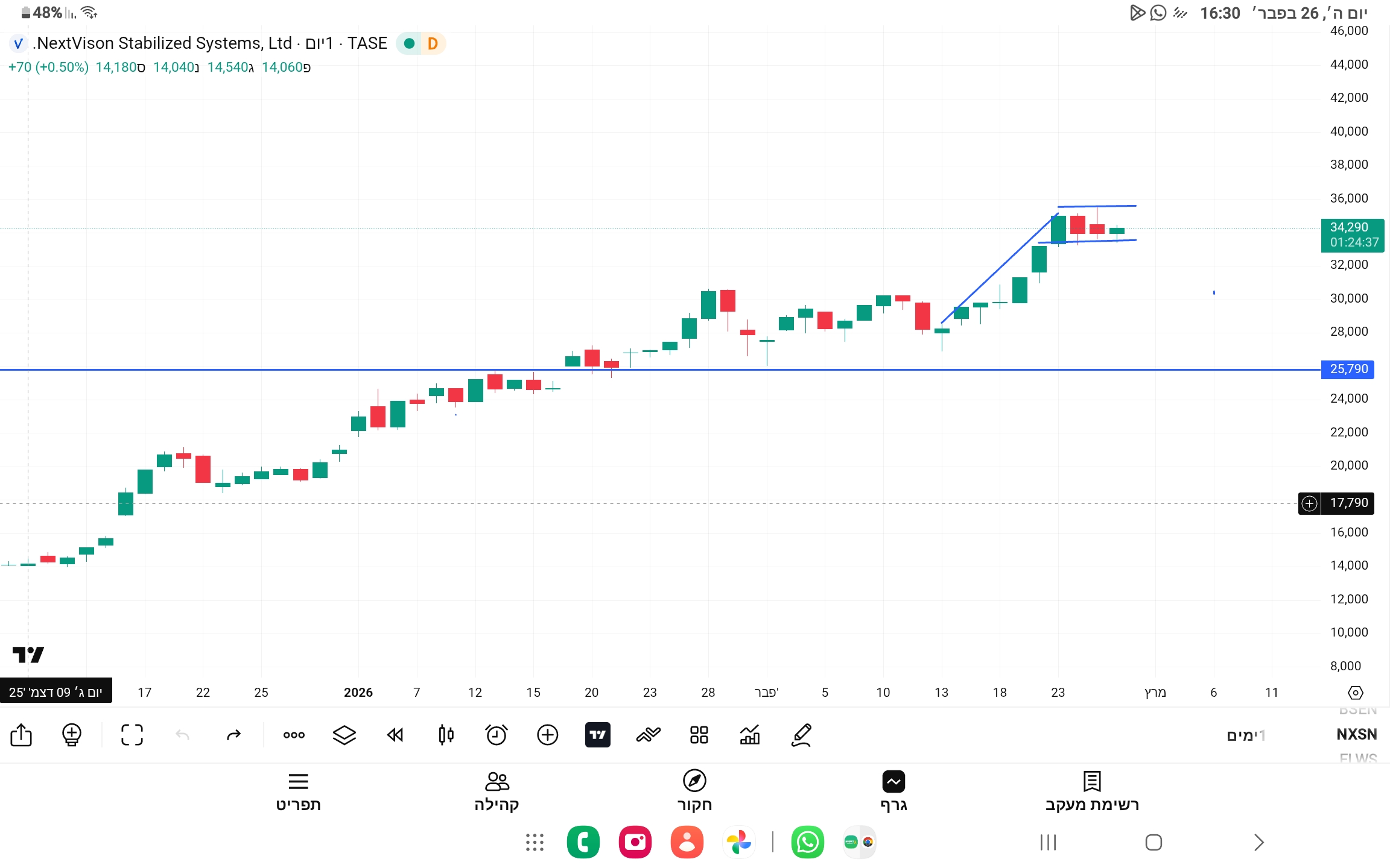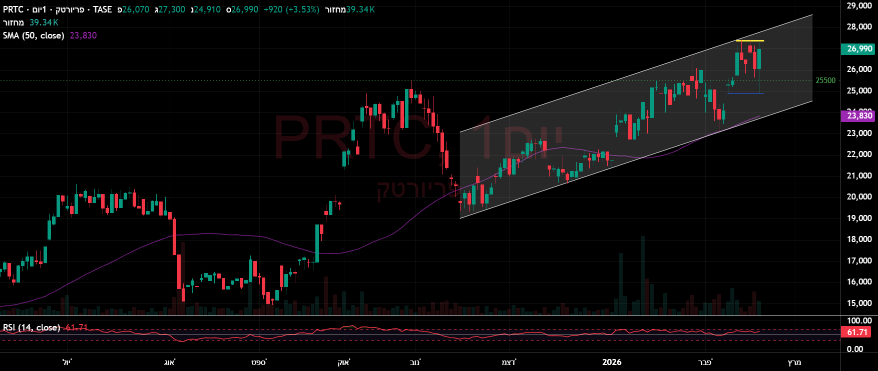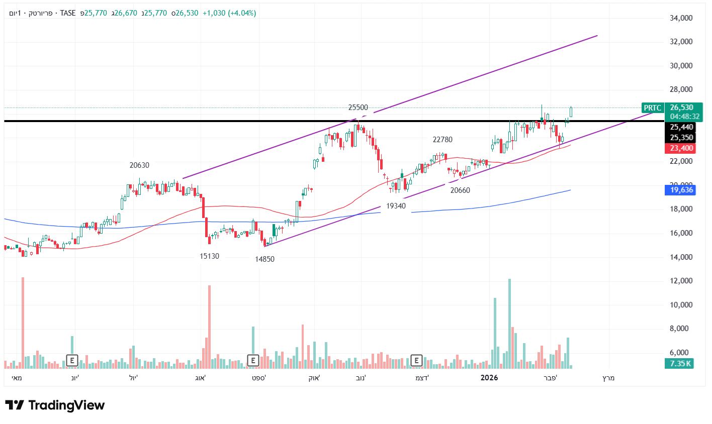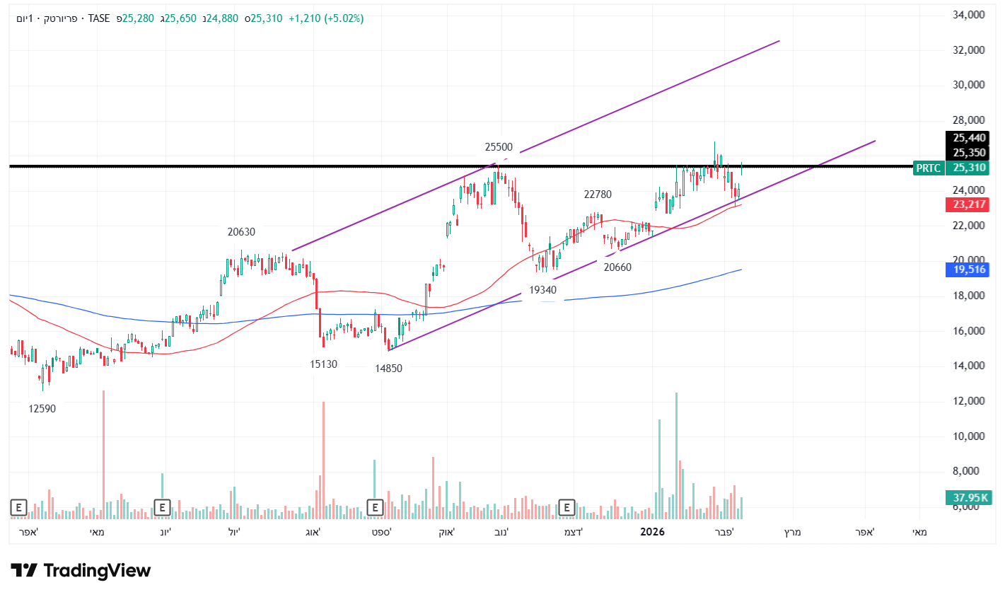 קצה תעלה עולה של הטווח הבינוני,וממשיכה אל יעד הדגל,ובמחזור גבוה מאד,נכון לעכשיו.כמו כן קחו בחשבון שמחר יפורסם הדוח הרבעוני/השנתי ל 2025,והצפי לשנת-2026/27. רמו כן,מעבר לים עוברת לגבוהיות שנתיות.