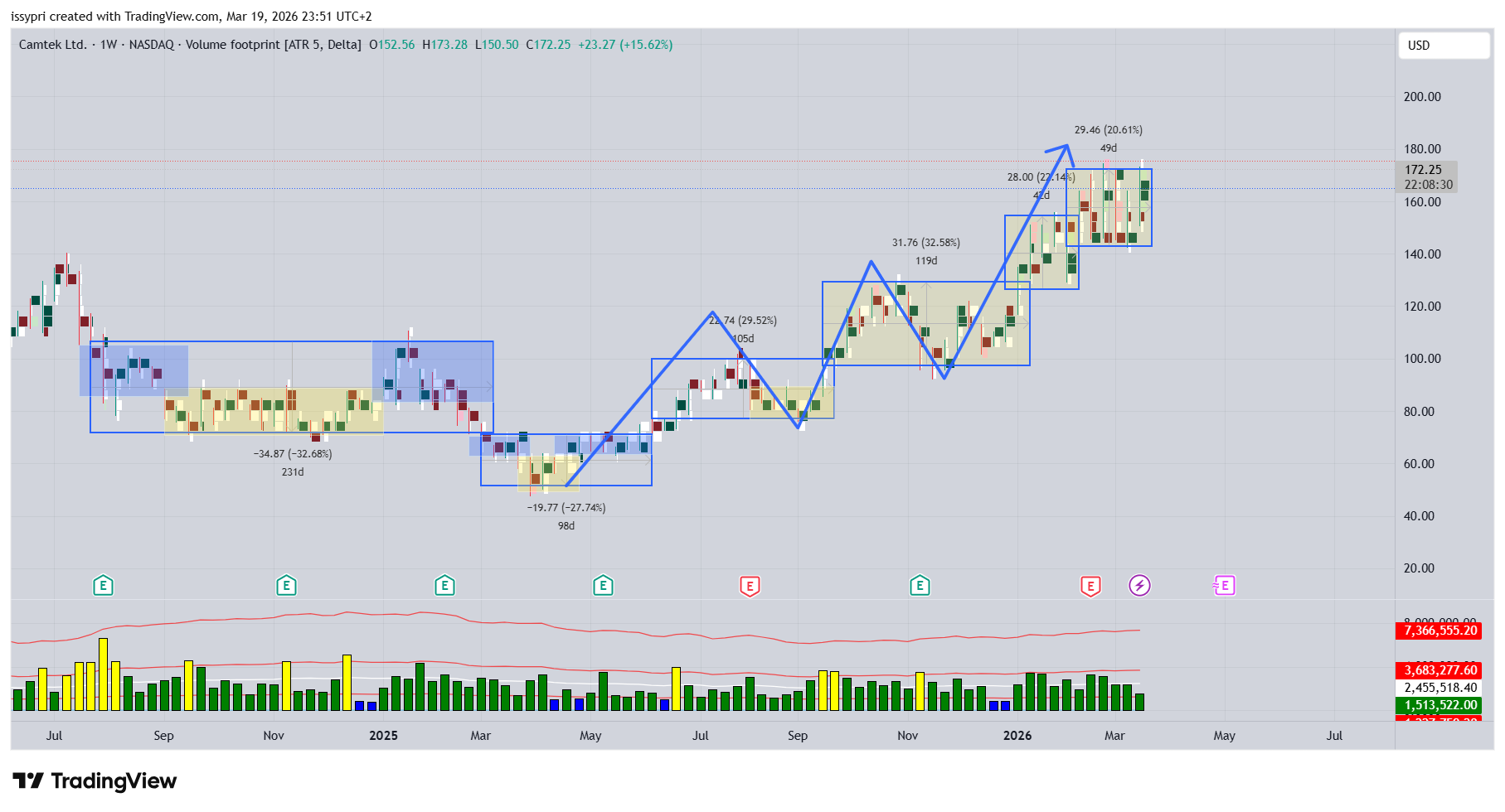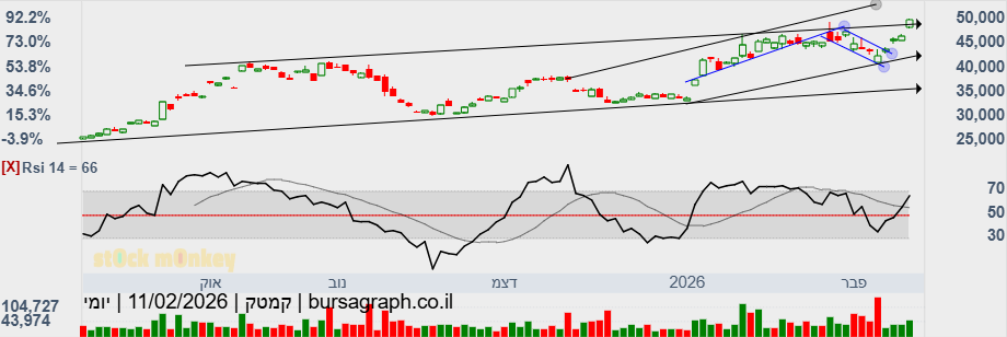 לפני כ 4 ימים פירסמה את הדוח הרבעוני האחרון והשנתי של 2025 שהיה מאד חיובי,וכמו כן הצפי ל 2026 עם אפשרות לגידול חד ברווחים,ולא לחינם עלתה היום בת"א 9%,ובניגוד לירידות החדות שהיו לאורך כל השוק,ובעיקר למניות המעוף, כנגעה היום בשיא השנתי והמשיכה עם בנית הדגל,וכל הנל מראה להערכתי את אמון המשקיעים בשנה/שנתיים האחרונות בחברה. כמו כן,התיפקוד של המניה בנסדק מאד דומה לזו שבת"א אולם כאן ניתן להבחין על ביצבוץ קל של פריצת הדגל,ובמחזור גבוה של 105% מהממוצע התלת חודשי במניה. אין לראות בנל כל המלצה לקניה/ מכירה1
