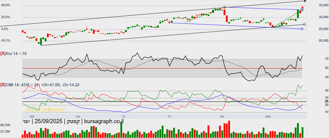 ממשיכה צעד צעד אל יעד ההיתנגדות של השנה האחרונה שעומדת על 110.73$,כשהמחזורים בשבועות האחרונים גבוהים מאד,ואתמול סגרה במחזור של קרוב ל 250% מהממוצע התלת חודשי במניה,ומתקרבת אל קצה התעלה המינורית,ובהתאמה אל קצה התעלה ארוכת הטווח.לע"ד,עד ימי חול המועד סוכות עשויים לדקדק את ההיתנגדות הוותיקה מלפני שנה!?