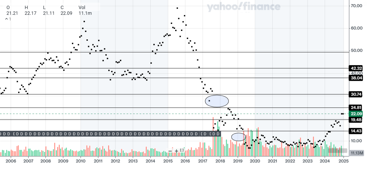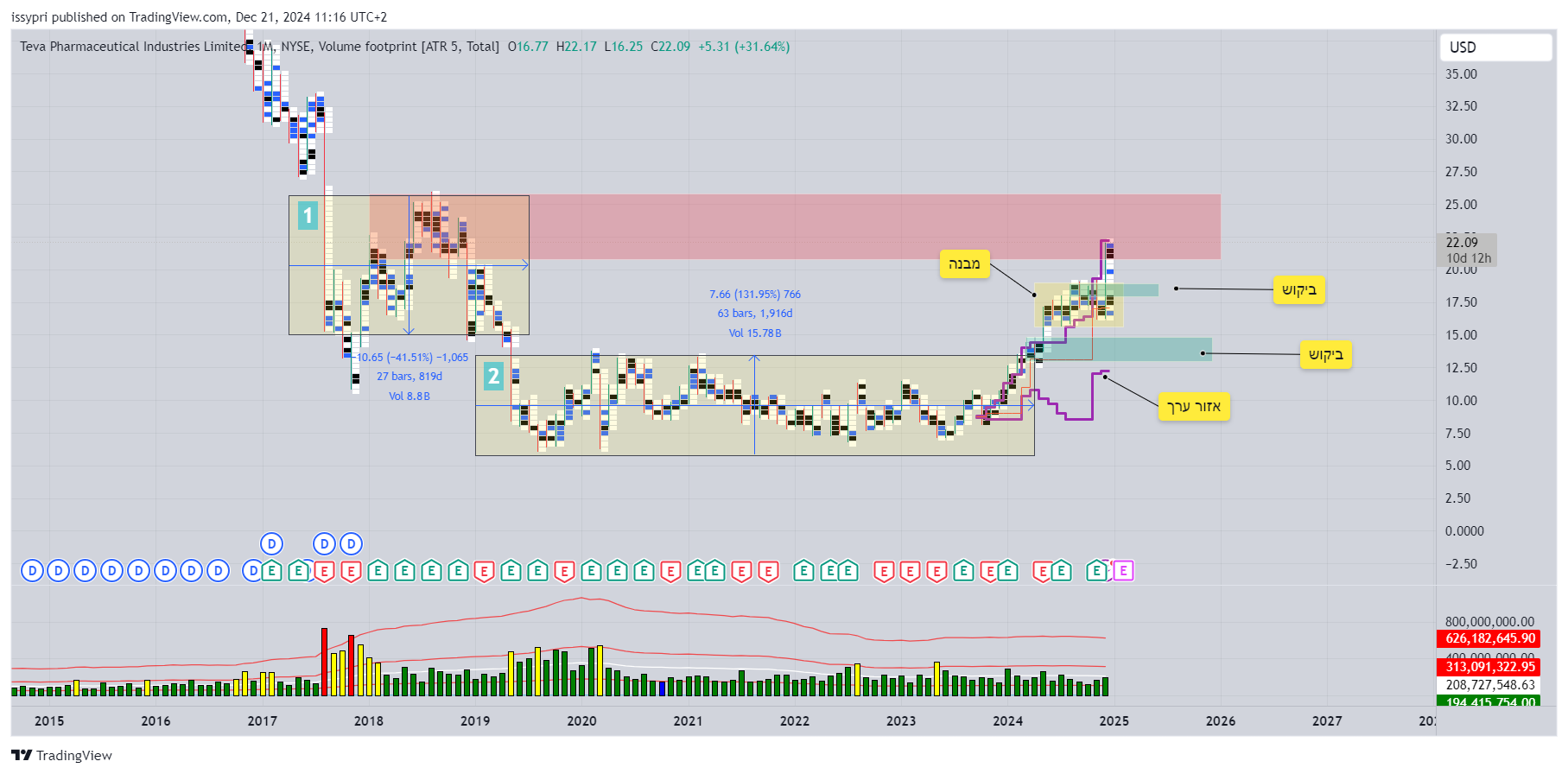 גרף ברזולוציה חודשית. הערכה הקודמת שלי שהמחיר ייסוג מהאזור המסומן "מבנה" לא הייתה נכונה והמחיר ממשיך לקבל דחיפה של קונים. האזור הנוכחי הוא אזור המוכרים האחרון של המבנה מ 2018. 20.8-25.8. דבר אחד עיקרי צריך בשביל לעבור אזור כזה והוא מספיק רצון של קונים לשלם מחיר גבוה יותר... רצון כזה יתבטא בפקודות מרקט לקניה המשכיות ועיכול של פקודות הלימיט שנמצאות שם למכירה. אזור 18-19 הוא אזור הביקוש הקרוב. האזור התחתון באזור הערך עומד על 12.5 ואזור הווליום הגבוה ביותר (POC) עומד על אזור 17.2. צפי - אין כרגע. מחכה לראות איך המחיר יתמודד עם אזור ההיצע הנוכחי.