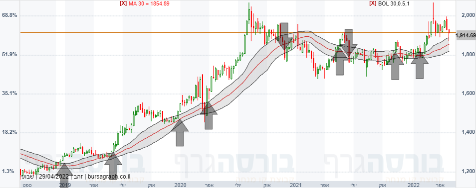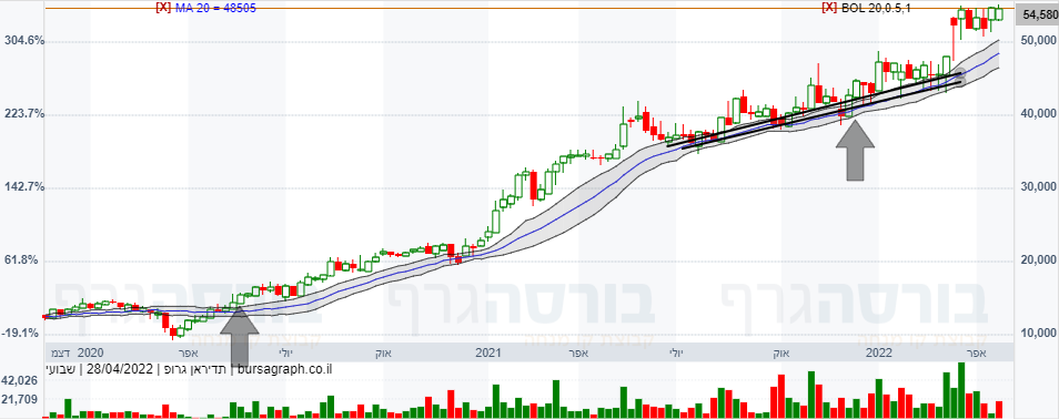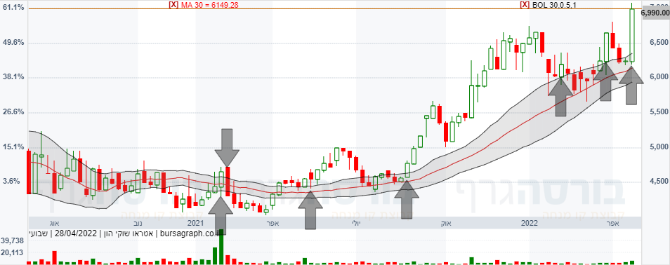 להרבה נכסים לדוגמא תדיראן עם ממוצע נע 20 שבועי שזה מה שמתאים לה (רוב הממוצעים בשבועי שיתמכו יהיו 10 או 20 או 30) זה עובד מצויין על מניות שפורצות לשיא כל הזמנים אחרי התכנסות כאמור לסוחרי טווח ארוך בלבד . לא עושים ככה מאות אחוזים בשנה אבל מצד שני אפשר להיות אדיש לגמרי למה שקורה בשוק כי מנהלים פוזיציה לנייר וזהו אם הייתי מנהל כסף מוסדי הייתי עובד בשיטה הזו סביר להניח קונה את כל המניות שפורצות לשיא שנתי בגרף שבועי אחרי התכנסות ודוגר עליהן כל עוד מעל הרצועות