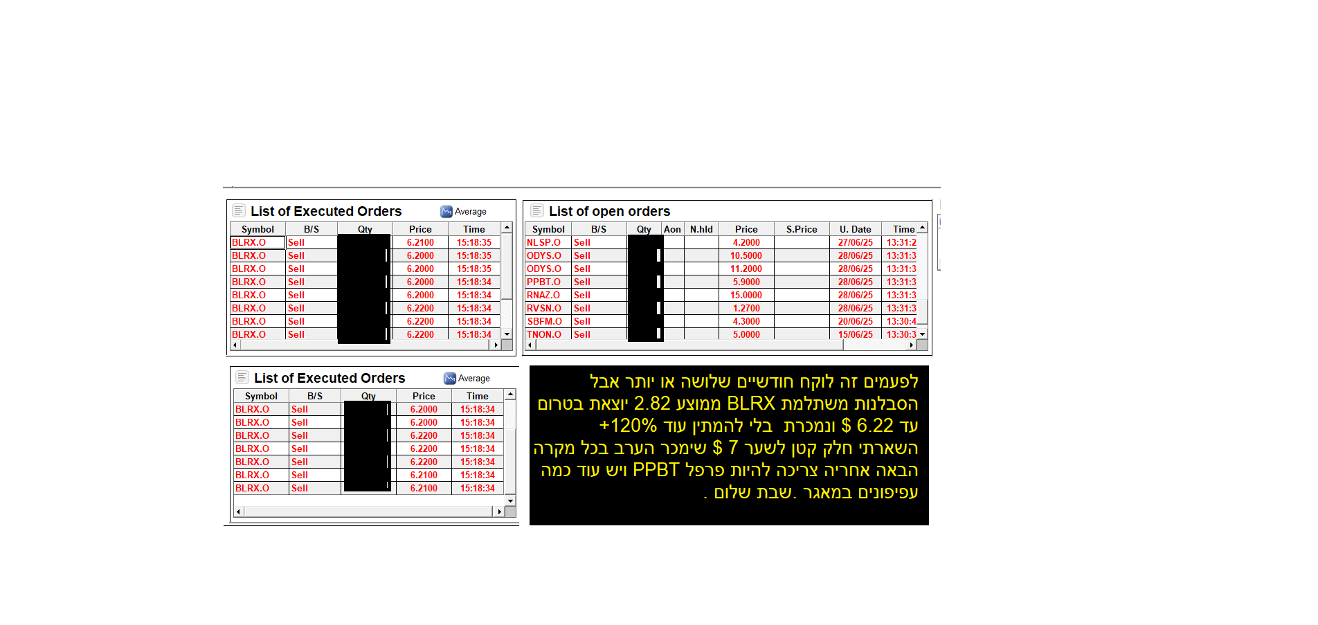 אני קורא כמה פוסטים של אכזבות מהחברים ואני שואל ? מה אתם נולדתם היום ? האם אתם לא ערים למתרחש מסביב ? לא רואים את אי היציבות השוררת בשווקים כבר תקופה ארוכה ? כמו שאתמול פתחו ירידות באופן ברור שהלכו והתמתנו לקראת נעילה היום יכולים לפתוח בטיל עליות ללא כל סיבה נראית לעין . ולכן נדרשת הרב יותר סבלנות בתקופה הזאת. זאת הסיבה שאני ממעט לכתוב ומעדיף לעשות לביתי . יש אכזבות מכמה מניות ? ICCM NLSP PPBT BLRX ואחרות ? אז קודם כל צריך לדעת לקרוא את המפה נכון לפני שופכים חומצה ושורפים המועדון . לוותיקים בינינו בוודאי זכורה "קופת דן חסכן" זאת קופה שהיינו חוסכים בה גרוש לגרוש ויום אחד היינו פותחים ומגלים מטמון אז גם כאן כל התנאים מראים על כיוון נכון זה שמהמניות הולכות דווקא הפוך לא מחייב ולא מרמז על כלום מעבר לעובדה שהן תחת משחק של הסוכן . ממילא בחלק מהמניות ההשקעה לא גבוהה במיוחד ולכן עליה של 20% + לא לזה ציפינו וייחלנו לדוגמא אני ברווח של 22% + ב BLRX (יש דיווחי קניות) האם אני מוכר ? לא ולא ...ממתין לפחות לעליה של 100%+ ומדוע?< הסיכון שווה עבורי. ICCM אמנם הכל בשקט נעשה אוכל לומר שאתמול נרכשו על ידי סד"ג של 30000K $ בשערים 1.22-1.24 וזה נועד להחזיר כמות שנמכרה יום יומיים לפני זה בין 1.3 ל 1.32 זכרו שאייס ירדה עד 1.05 וגם שם בין 1.05-1.11 בוצעו קניות . שעומדות כרגע למכירה כבדיקות שטח מקדימות לאנטנה . PPBT אחרי מיצוע האתמול אני יושב שם בהפסד 3.5 %- שיכול להימחק בשניות NLSP אני ממוצע 1.6 בהפסד קל תלוי איך מסתכלים . הקיצר תנו קצת צאנס . אייס יש גידול במחזורים ואני תקווה שנראה שם תנועה צפונית בקרוב. בכל מקרה מי שרוצה 1.35 ומעלה אני מכור חג שמח