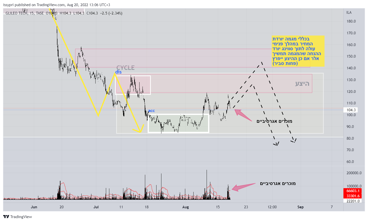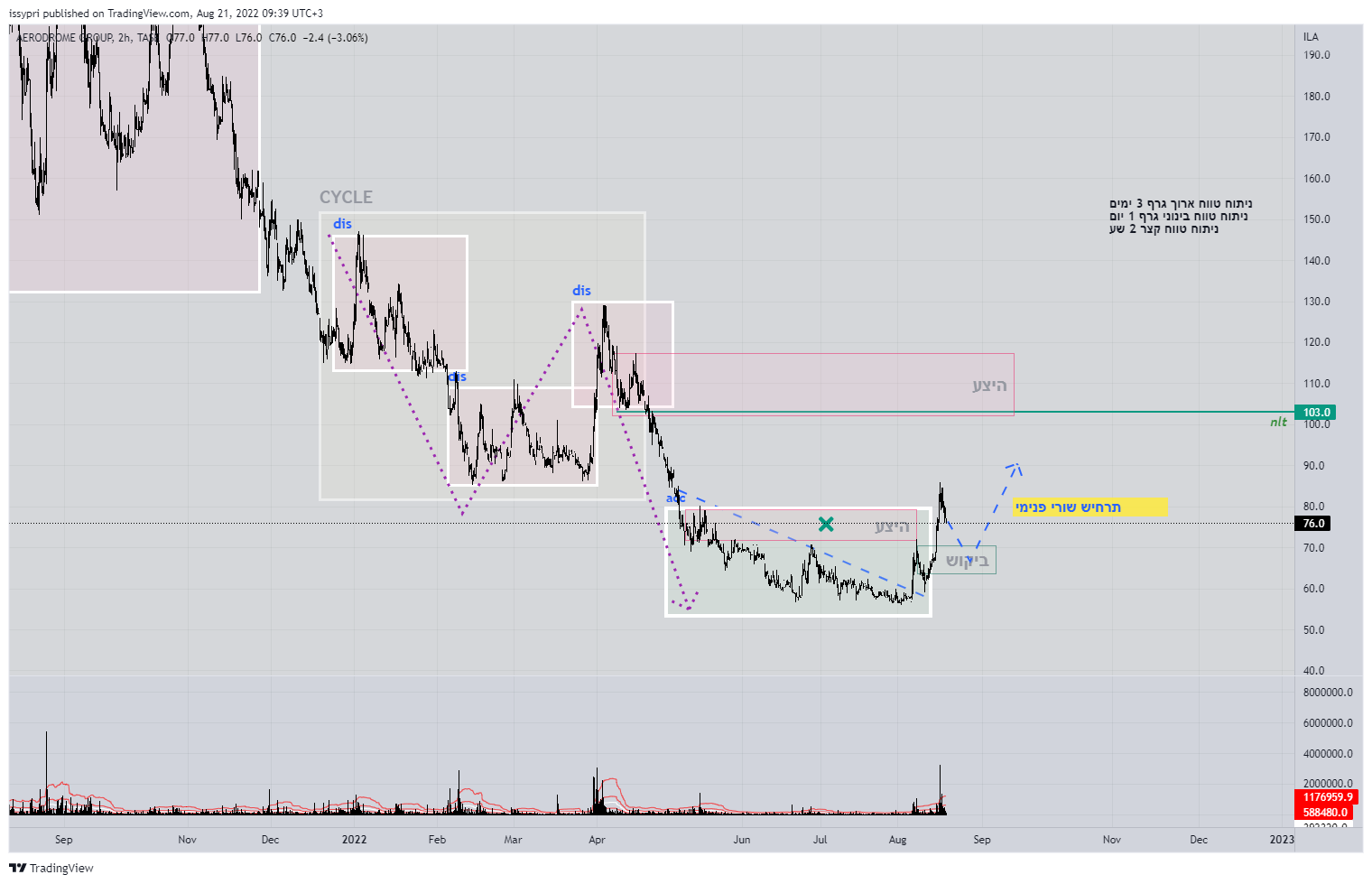 המגמה יורדת (סגול) המחיר ביצע איסוף פרץ את ההיצע הפנימי וההנחה שהוא יתקדם לכיוון ההיצע של המגמה הראשית. ייתכן ויתקן לאזור הביקוש קודם (63-70).