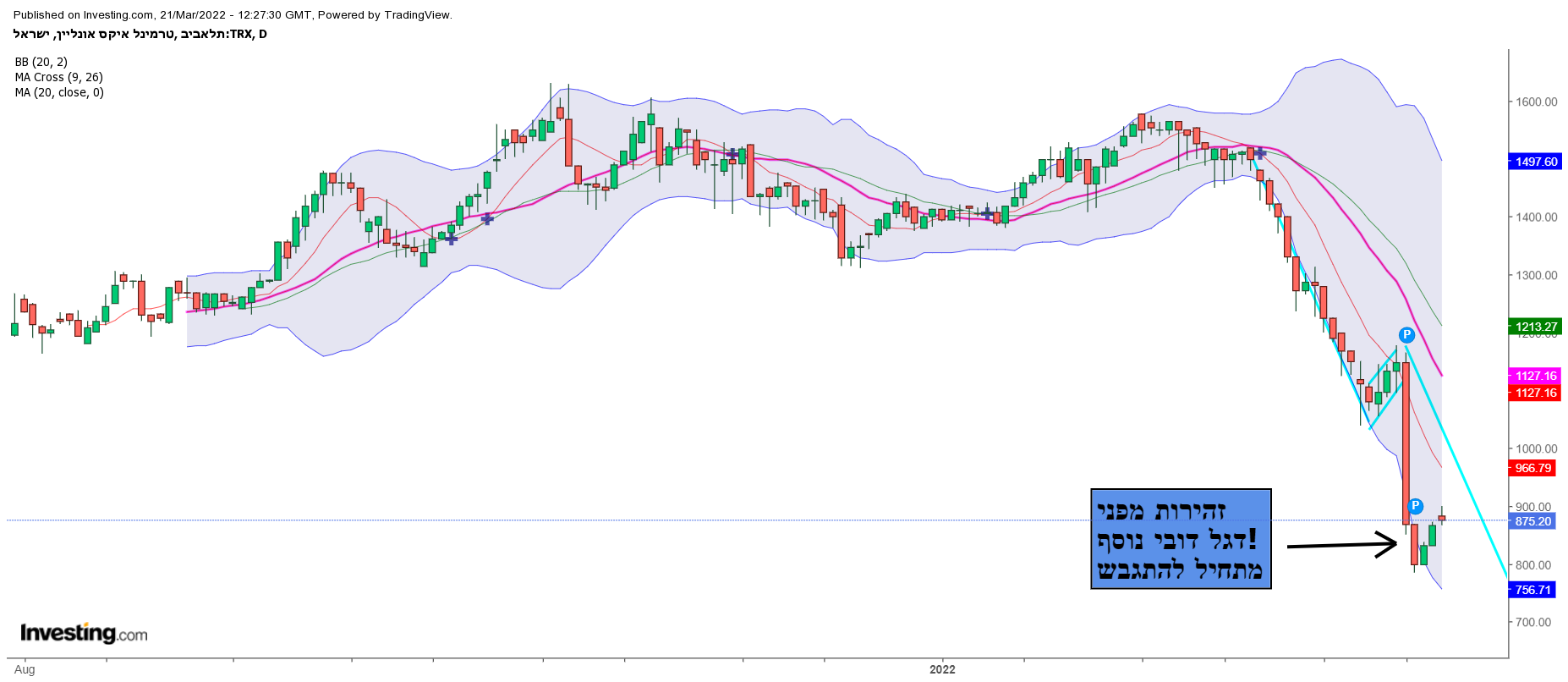 כן לע"ד. שלחתי בתאריך 13.3.22 גרף עם דגל דובי. הדגל יצא לפועל בנר אכזרי במיוחד!! יחד עם זאת, עם כל הצער שבדבר, יעד הדגל עוד לא מומש במלואו!! כרגע נראה שהנייר מצא תחתית חדשה, אולם יש להיזהר מדגל דובי נוסף כפי שציינתי על הגרף. כרגע כניסה היא ברמת סיכון גבוהה מידי לטעמי. מקום לאופטימיות יהיה במידה ותצליח לייצר 2 שפלים עולים, כלומר עוד שפל עולה. מי שבפנים, צריך הרבה סבלנות לדעתי עד שהכסף יחזור. הנייר נסחר ברמות שפל חדשות והנר העצבני שהתקבל יכול להתפתח גם לסכין נופלת כמו שהיה עם בלייד ריינגר (כדאי לראות בגרף). ברגע שמגיעים לשיא/שפל כל הזמנים, קשה יותר לקבוע היכן זה ייעצר...🤞