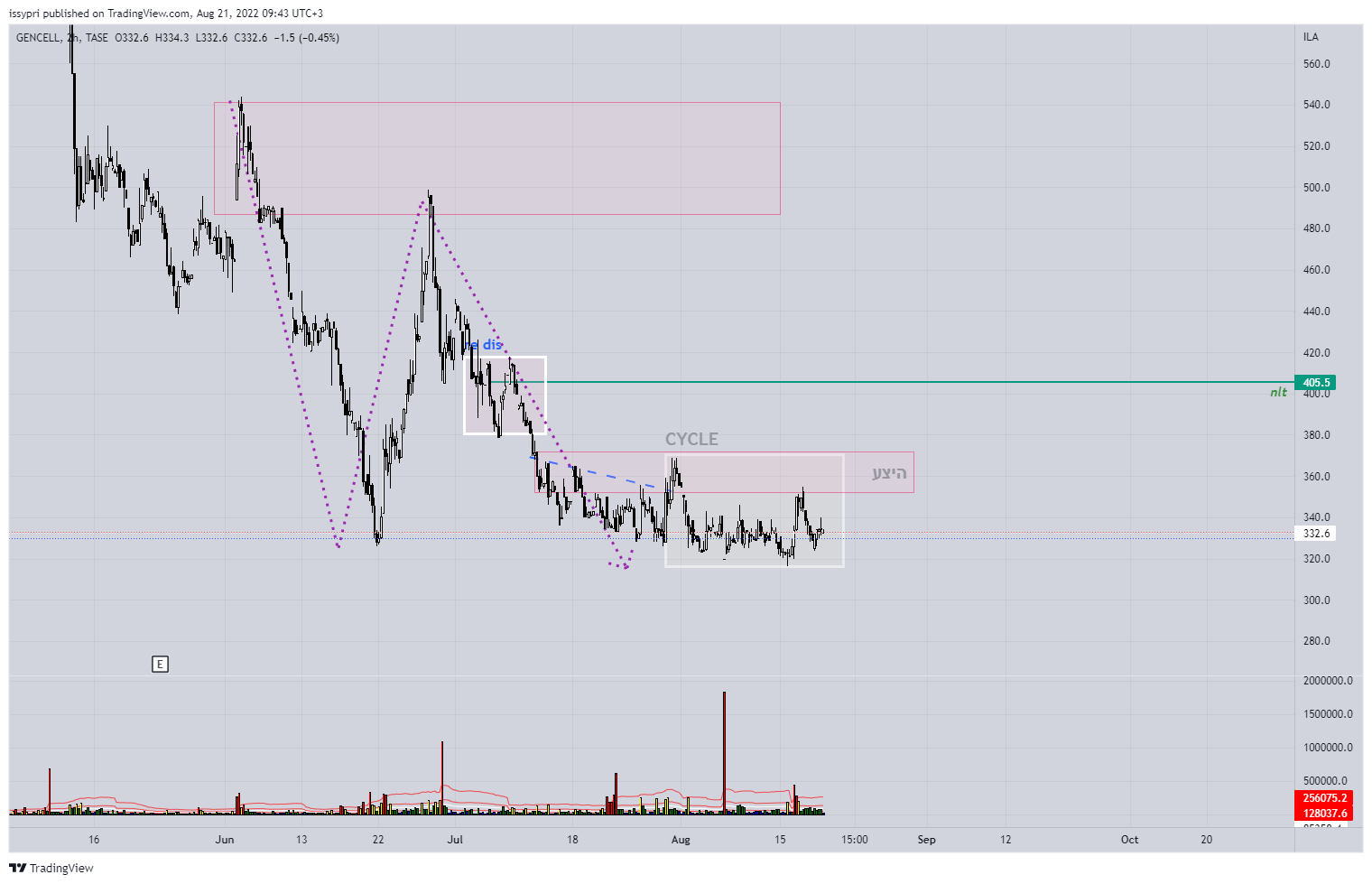 מגמה יורדת ראשית (סגול) אפשרות לאיסוף בתנאי שההיצע ייפרץ (351-370). אם זה יקרה תחנה ראשונה תהיה 405.