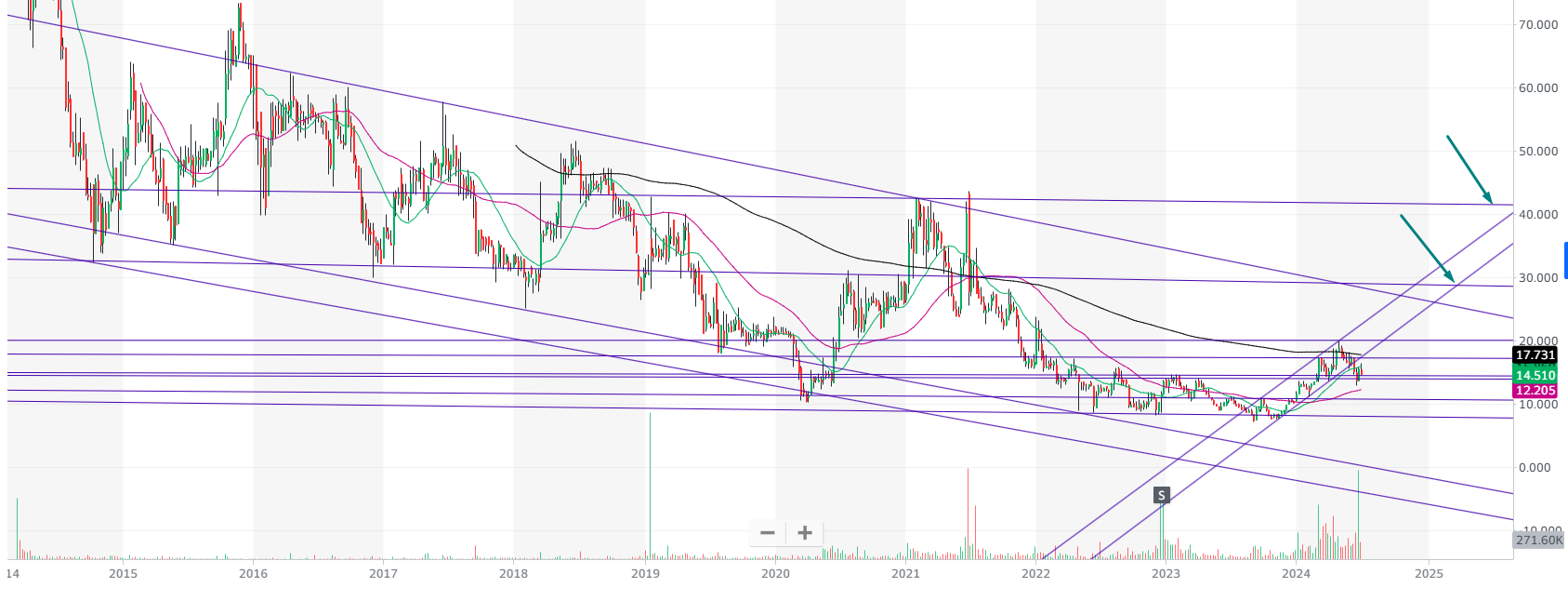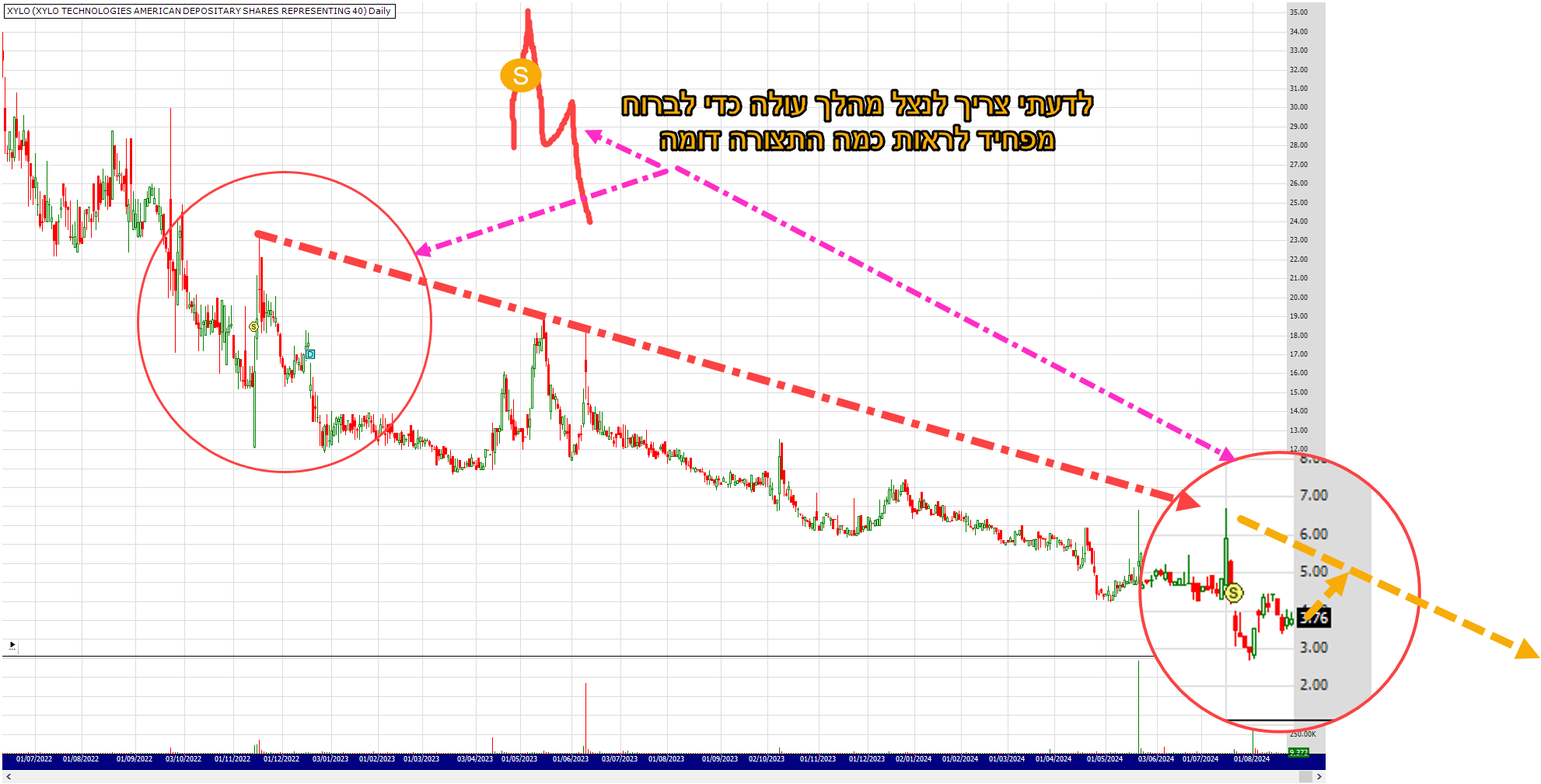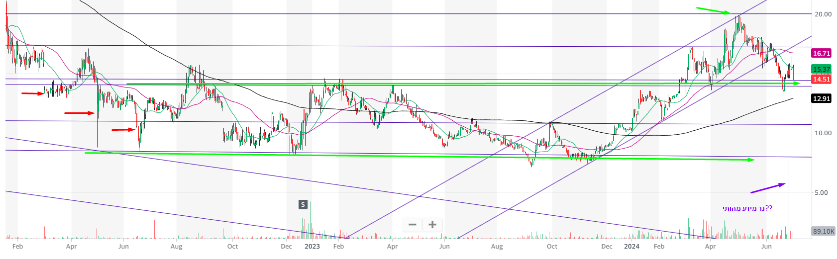 גרף יומי, אזכיר כי נכנסתי לפוזיציה לפני שנתיים בערך 5/2022. קניות במחיר ממוצע 11.2 (1.6 לפני ספליט 1:7) - מסומנות בחצים אדומים. היה דשדוש בטווח 8-14, בסופו של דבר נפרץ מעלה והגיע ליעד במחיר 20. מסומנים בירוק.... בשפל הייתי מופסד 30%, בשיא הייתי מורווח 76%, אבל לא מכרתי סנט (בדיעבד היה צריך להוציא חצי). כיום הפוזיציה ברווח 30%. לדעתי החברה זולה ותרכש בסוף ע"י אחת הגדולות בתחום, הרכישה שלי הייתה נטו פונדמנטלית לאור ההתפתחויות והאישור לבטיחות ולשיווק המוצרים. אני מאמין בחברה ובהנהלה, עשו צעדים מדהימים בשנים האחרונות ועדיין נמצאת במחיר מצחיק. העלייה אתמול של כלל ביו המחזיקה בחברה והשמועות על הצעת רכש מעניינות, נראה מה יהיה במסחר היום.....בהצלחה למחזיקים (לפני מספר ימים היה מחזור חריג מאד במסחר - רמז???, מסומן בסגול) אגב הסטופ שלי נמצא במחיר הכניסה.