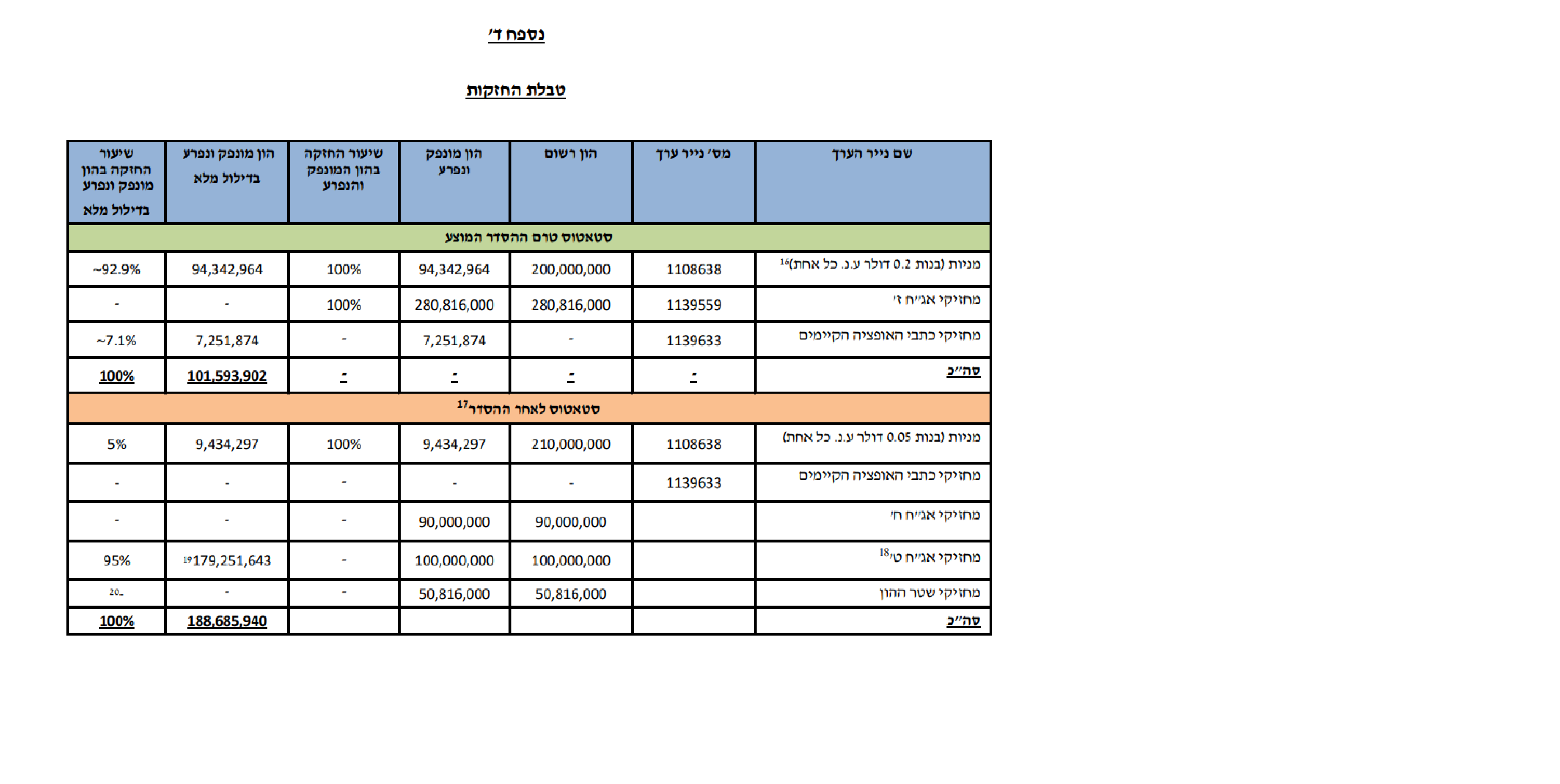הסדר עם מחזיקי אג"ח ז' עיקרי ההסדר הינם כדלקמן: ) 1 )פירעון מוקדם. למחזיקי האג"ח בסך של 20,000,000 ש"ח ערך נקוב וכן הריבית שנצברה על תשלום זה( ללא קנס, עמלה, פיצוי ו/או תשלום נוסף בגין הפירעון המוקדם כאמור, אשר לאחר מכן יעמוד היקף סדרת אג"ח ז' שבמחזור על סך של 260,816,000 ש"ח ערך נקוב )"יתרת אג"ח ז'"(; )2 )הקצאת ניירות ערך חדשים. הקצאת אגרות חוב חדשות מסדרה ח' )אג"ח סטרייט בהיקף של 100,000,000 ש"ח ע.נ.( )"אג"ח ח'"( ומסדרה ט' )אג"ח להמרה - בהיקף של 90,000,000 ש"ח ע.נ.( ) "אג"ח ט'"( ושטר הון )ניתן להמרה - בהיקף של 50,816,000 ₪ ע.נ.( )"שטר ההון"( אשר יוקצו על-ידי החברה בכפוף להתקיימות התנאים המתלים הקבועים בהסדר, אגב מחיקתה של יתרת אג"ח ז' ומחיקתן מרישום למסחר בבורסה לנייורת ערך בתל אביב בע"מ )"הבורסה"(, כמפורט בהסדר )אג"ח ח', אג"ח ט' ושטר ההון יכונו להלן: "ניירו ת הערך החדשים "( ; )3 )רישום שעבוד נוסף. שעבוד קבוע על מלוא החזקות החברה )%100 )מהון המניות המונפק והנפרע( בחברה הקפריסאית Limited Investment Boutonne ועל מלוא החזקותיה )%100 מהון המניות המונפק והנפרע( בחברה הרוסית – .LLC 8-Petra" ( פטרה"(, בעלת הזכויות בפרויקט הנדל"ן למגורים בסנט פטרסבורג, )כמו גם רישום מחדש של השעבודים הקיימים לטובת מחזיקי אג"ח ז' להבטחת ניירות הערך החדשים( וזאת כנגד ביטול אג"ח ז' )או יתרת אג"ח ז' לפי הענין(. בהקשר זה נקבע מדרג פנימי בין הבטוחות אותם התחייבה החברה ליצור לטובת מחזיקי ניירות הערך החדשים באופן שהבטוחות 5 אשר תירשמנה )קרי השעבוד הנוסף והשעבודים הקיימים( לטובת מחזיקי אג"ח ח', אג"ח ט' ושטר ההון תהיינה בדרגה ראשונה, שנייה ושלישית, בהתאמה ובאותו סדר בכירות; )4 )מחיקת חוב. שווה ערך ל- 20,000,000 ש"ח ערך נקוב אג"ח ז'. ו-) 5 )מתן אפשרות לביצוע המרה כפויה. )ביוזמת החברה( של אג"ח ט' ושטר ההון להון מניות רגילות של החברה. והכל כמפורט בתכנית ההסדר. בכל הנוגע לכתבי האופציה שהוקצו להנהלת החברה )במסגרת הסדר החוב של שנת 2016( ראו ערך 'כתבי האופציה הקיימים' בתכנית ההסדר), הם יתבטלו מאיליהם וימחקו, ללא תמורה כלשהי למחזיקי כתבי האופציה הקיימים כך שהן לא יקנו למחזיקי כתבי האופציה הקיימים זכות כלשהי על פיהן. בנוסף, נקבע מנגנון לתגמול הנהלת החברה כתלות בהחזר החוב )Recovery )למחזיקי אגרות החוב החדשות ושטר ההון, כמפורט בתכנית ההסדר. לאחר השלמת ההסדר בכוונת החברה לאמץ, לצורך צמצום בעלויותיה, את ההקלות ל -'תאגיד קטן פטור', ובכלל זה היעדר החובה לפרסם דוחות לרבעון הראשון והשלישי בהתאם לתקנה 5ד')ב()5 ) לתקנות הדוחות, והכל בכפוף להוראות הדין בנושא.