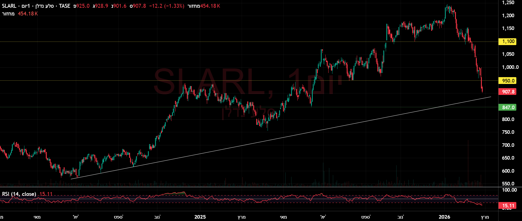 קרן הריט סלע נדלן היא מניית ערך עם צמיחה מתמדת בסעיף המכירות. מהבחינה הטכנית - תמיכת פיבו על 947 שהיא תמיכה אופקית וכן על קו מגמה עולה. מחזיק ולא ממליץ.