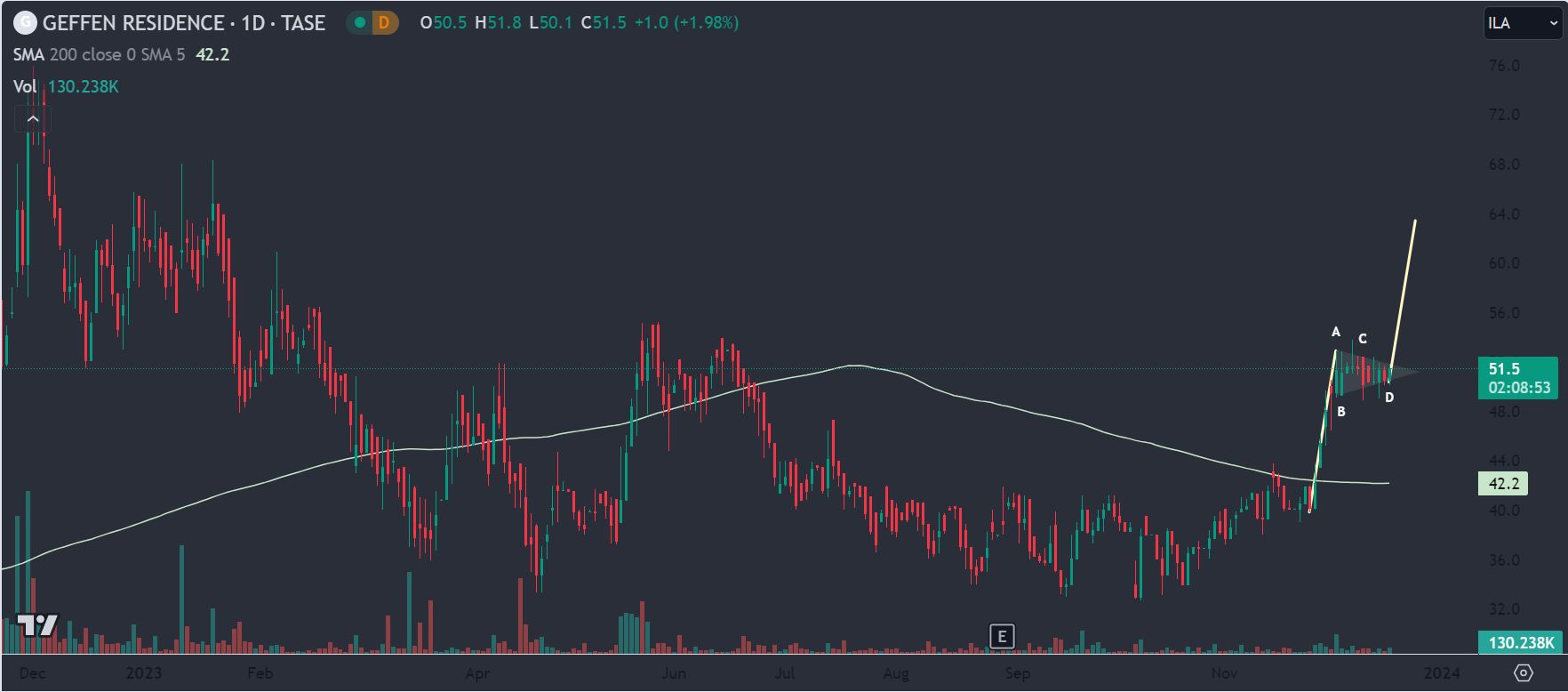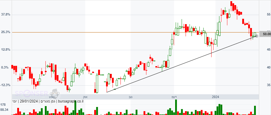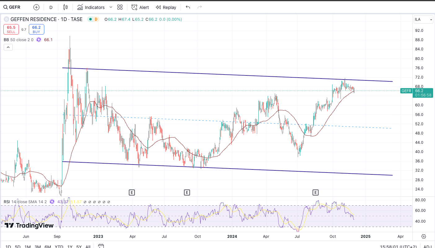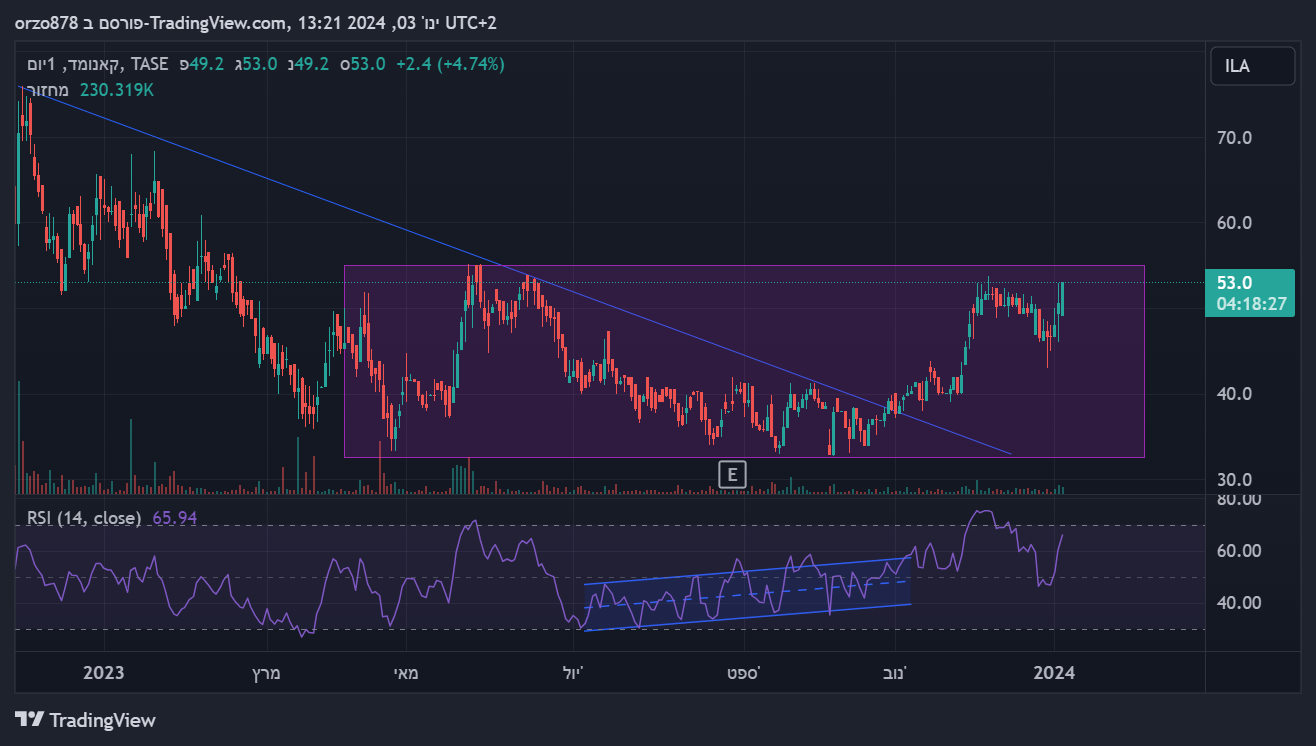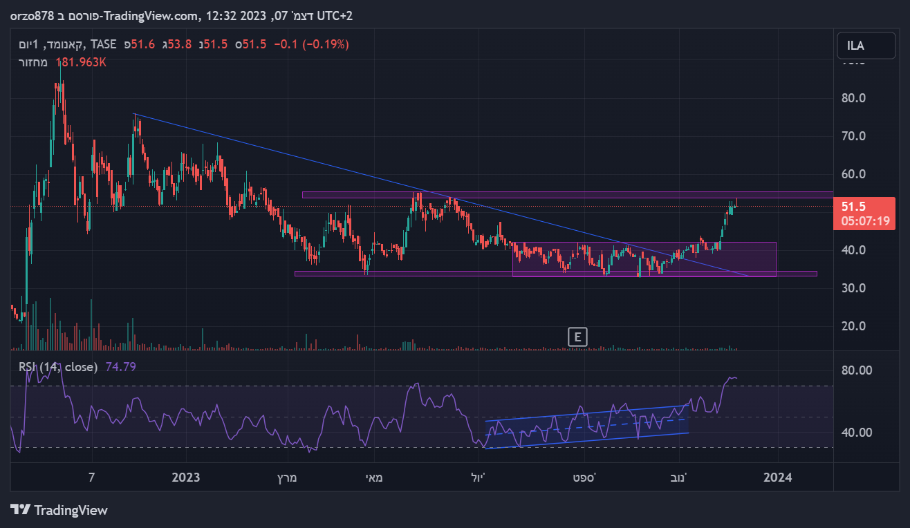 יכולה להוציא דגל בסגירה מעל 50, אישור סופי ליציאה קדימה מעל 54. יעד 60 לסוף מהלך קצר טווח. מנייה מלעונה שנמצאת בתחום חם ללא תזוזה וללא עניין (לפחות כרגע). יש מגמה של מוסדיים שנכנסים בחברות נדל"ן כגוף מלווה למימון פרויקטים - לא מן הנמנע שנראה את התופעה גם שם (ספקולציה ברגע נוכחי זה).