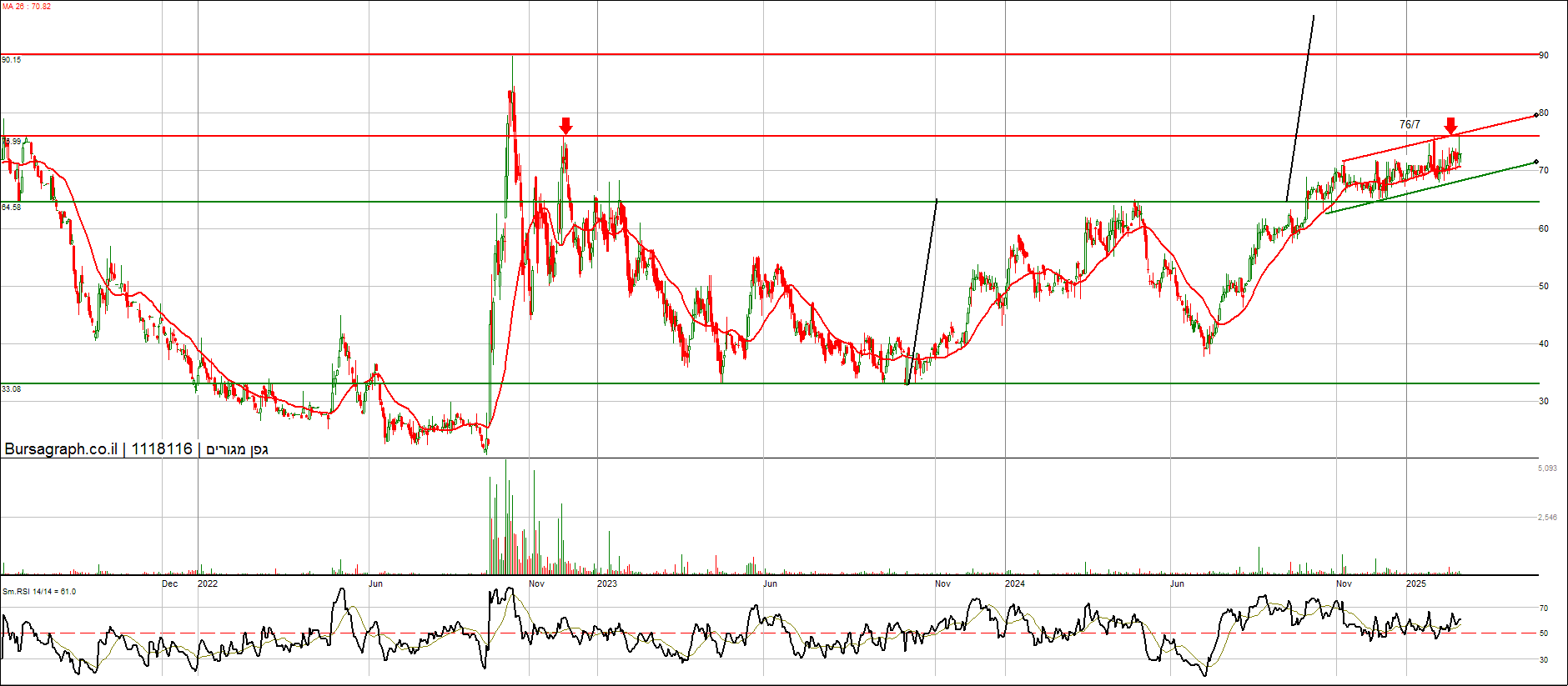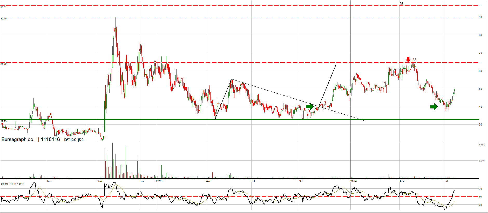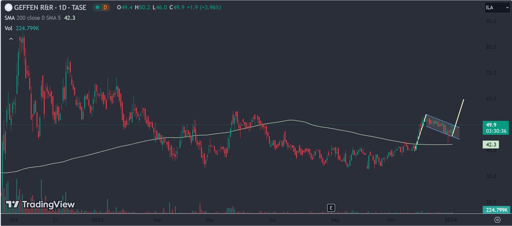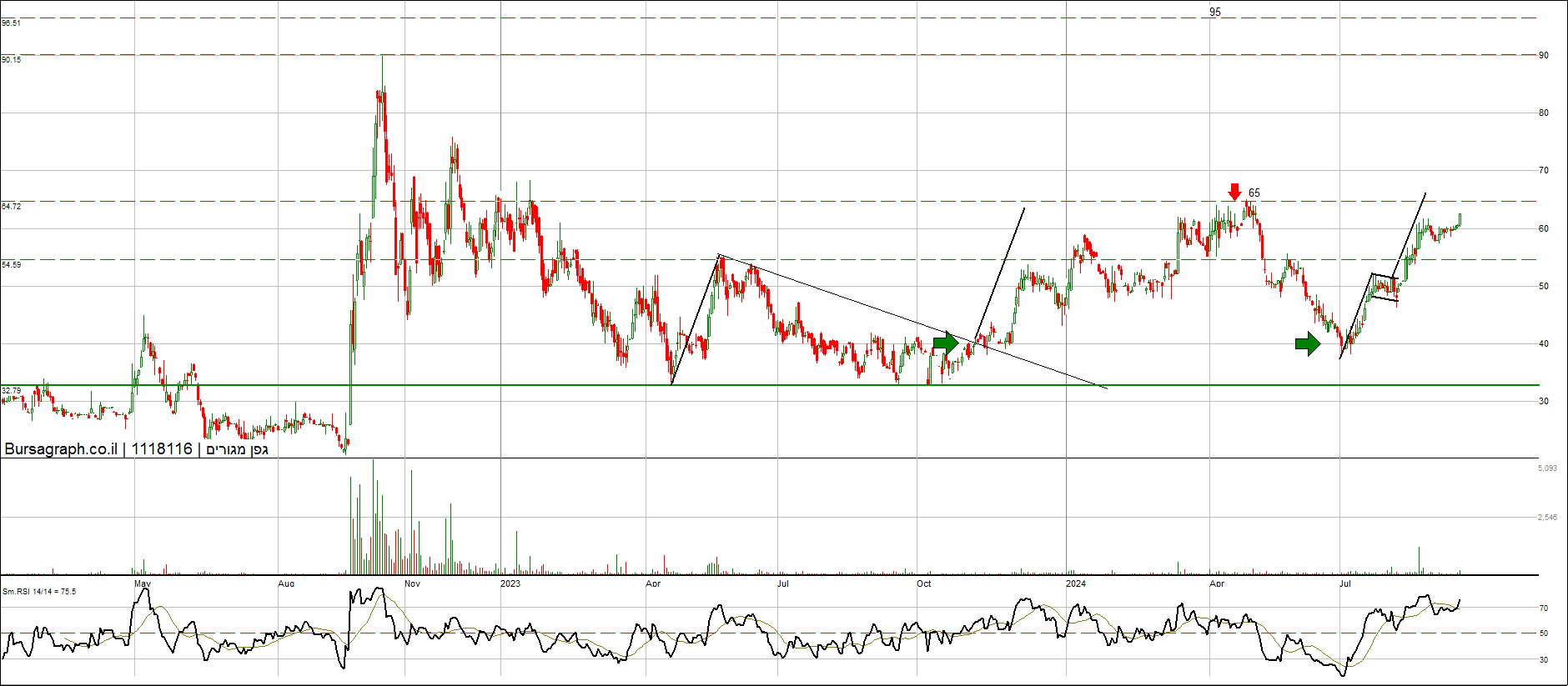 יכולה להוציא דגל בסגירה מעל 50, אישור סופי ליציאה קדימה מעל 54. יעד 60 לסוף מהלך קצר טווח. מנייה מלעונה שנמצאת בתחום חם ללא תזוזה וללא עניין (לפחות כרגע). יש מגמה של מוסדיים שנכנסים בחברות נדל"ן כגוף מלווה למימון פרויקטים - לא מן הנמנע שנראה את התופעה גם שם (ספקולציה ברגע נוכחי זה).
