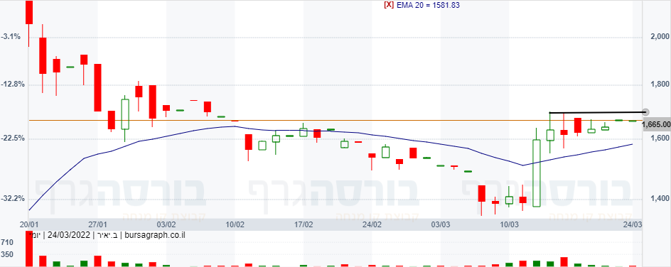 אותה תבנית מעל 1700 זה שתבינו עברתי על כל המניות בבורסה 10 פעמים בגרף יומי בגרף שבועי מצאתי 2 מניות שיתנו לפחות 5% בפריצה על סכום קטן ומהר מעלה לא בדיעבד ואני גם לא אעקוב אחריהן את התבניות שמצאתי בניירות הנזילים בגדול אני לא מעלה עם גרף וטריגר אבל לא קשה לדעת אינפיניה , ביומיט, אנלייט, פתאל , מגדלי תיכון , הזדמנות, פלוריסטם, גילת, ווישור, טראלייט , שופרסל ויש עוד כמה אבל זה בגדול