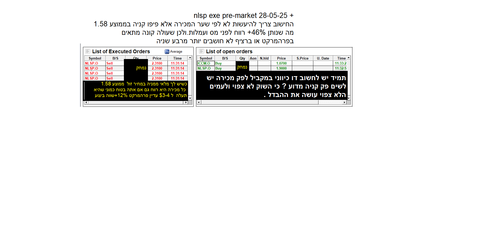 אני מעלה כאן צילום מסך עכשווי של המכירה שבוצעה ב שער 231 כדי להסביר איך צריך לפעול בפרה מרקט במיוחד אבל זה נכון גם לרציף ולאפטר כל הרעיון אם אתה כבר ממתין ללמניה מסויימת שתעלה אחרי שהיית בה בהפסד אין חובה וצורך להמתין עד שהיא תשלים את העליה שלה נניח במקרה הזה לאיזור 4$ טוב יעשה כ"א שכבר עבר לרווח וינצל מומנטום כדי לממש כי לפעמים מה שנראה בפרהמרקט מתהפך לו ברציף . ומה שמכרתי בפרה מרקט סביר להניח שאוכל לקנות זול יותר ברציף ומי ששואל למה למכור ב 2.31 אם אתה בטוח שהיא תעלה ל 4$ ? התשובה פשוטה 46%+ רווח הדבר נכון לכל מניה שנסחרת לא תמיד ההמתנה הארוכה למניה שתגיע לטופ שלה משתלמת מימוש במעלה הדרך תמיד מוכיח את עצמו אתמול זאת היתה ICCM ב 1.15-1.18 והיום זאת NLSP ב 2.31 מחר זאת תהיה אחרת חשוב שתבינו את הדרך.
