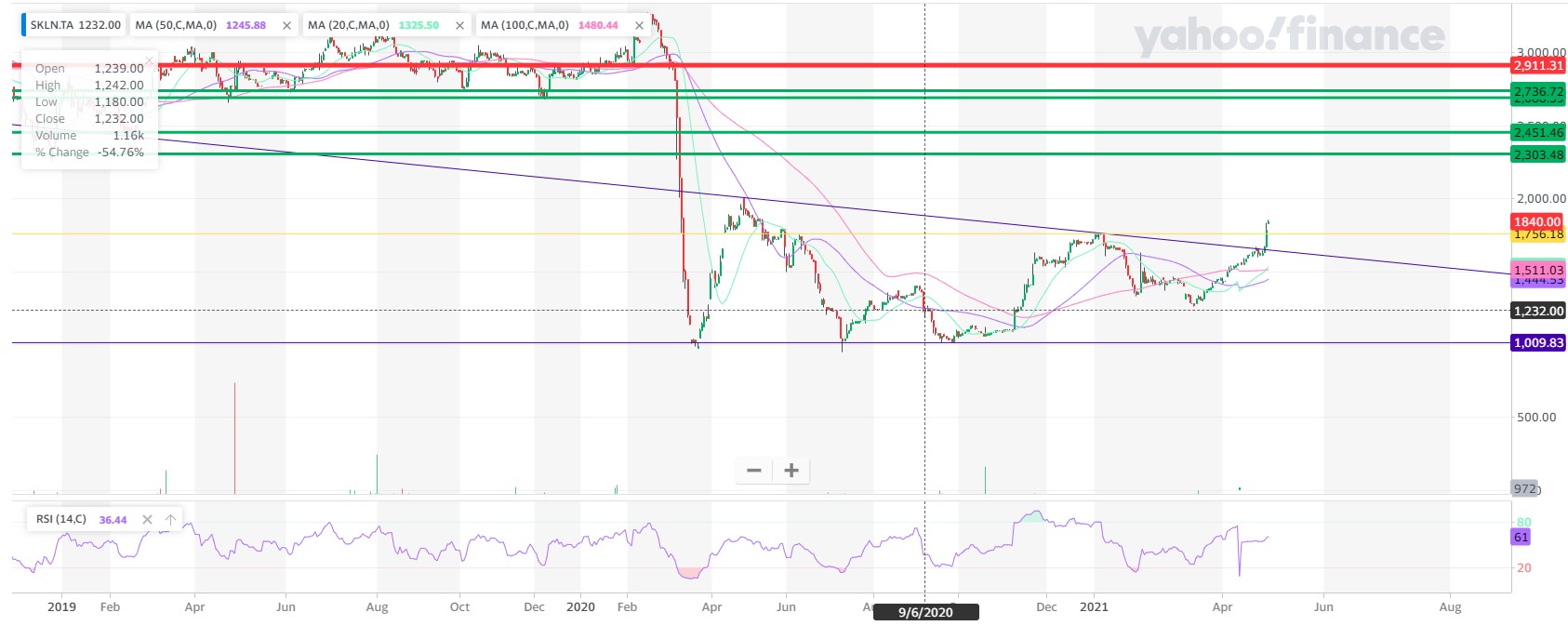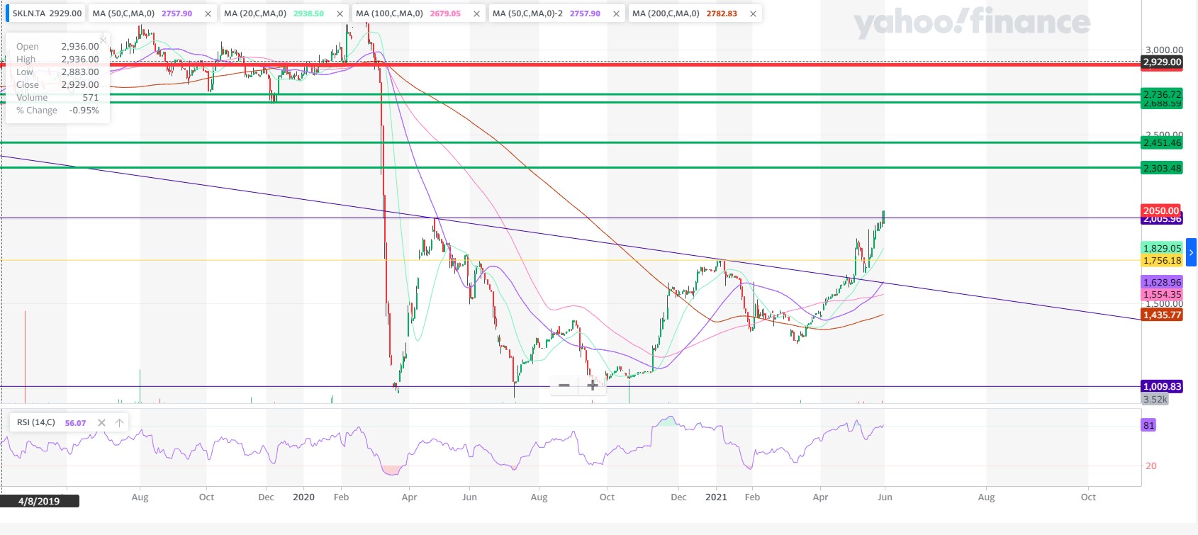 מתנהגת בינתיים בהתאם למה שכתבתי עליה בעבר. אז כתבתי, לאחר שחצתה התנגדות ב-1750, שצפויה התרעננות קלה, ומשם ליעד הבא - צליחת התנגדות ב-1900, ואז ל-2300. נכון להיום (לפני סגירה), פרצה התנגדות גם ב-2000 במחזור משמעותית גבוה יותר מבדר"כ, ועדיין מתומחרת משמעותית בחסר. אני עוד איתה לטווח הארוך, ולפחות עד 2700 +- שמגלם את השפל שלפני הקורונה. שם אפשר יהיה לחשוב על הפוזיציה, בהינתן תמחור הגיוני. כמובן לא המלצה וכו', ומחזיק כמות לא גדולה.