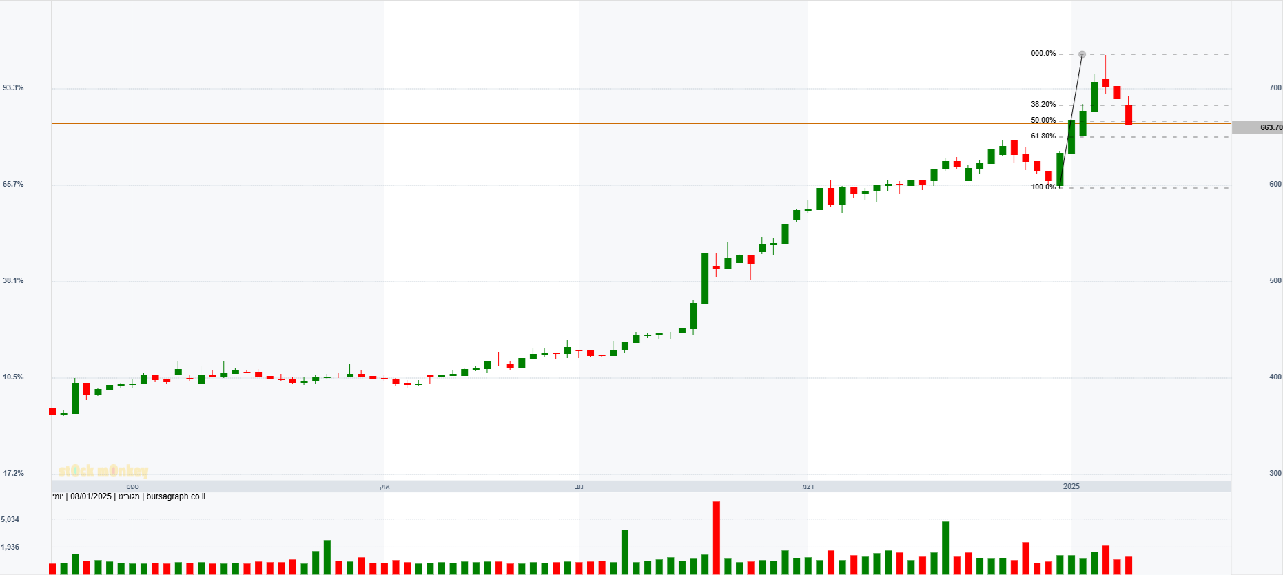 חזקה מאוד לאחרונה, חזרה לבולינגר אחרי בריחה למעלה והיום ירדה קצת מתחת לפיבו 50. צריכה להישאר מעל 650 (פיבו 61) על מנת להמשיך את העליות לא מחזיק ולא ממליץ