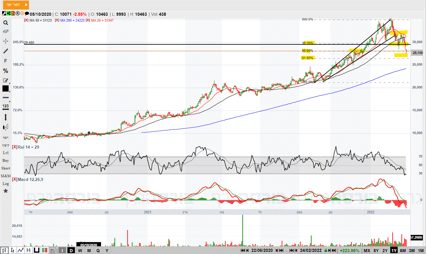 השלימה תיקון שליש בלבד למהלך הארוך שלה. נתמכה פעמיים באזור 6050 וזה טוב מצד אחד. מצד שני מתפתח שם משולש דובי שמונע ממני להיכנס אליה שוב. לדעתי יכולה לתקן בשקט לכיוון פיבו' 50 או 61.8, בפרט אם נראה ירידות בעולם בהמשך השבוע. עד שלא פורצת קו מגמה יורד, אין מה לדבר על שיאים חדשים או מהלך עולה נוסף לדעתי... גם היום בבוקר נסחרה מתחת לקו בתורכיז וזה מעיד על חולשה לדעתי... לגבי דמרי, אסתכל לעומק יותר מאוחר. נכנסתי לזמן קצר למחשב ומתנתק שוב... תודה בכל אופן על התגובה והניתוח! המשך שבוע מבורך...🙇🙇
