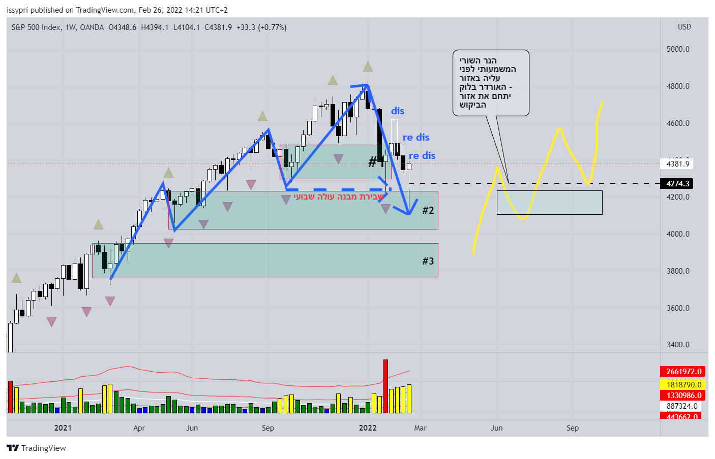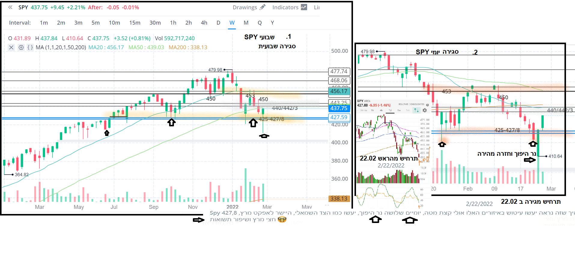 מהיר חזרה לאיזור 425-427 והמשיכו הלאה ליעד 437 + (קישור תוך יומי) טכנית, עפ"י התנהלות המסחר ביומיים האחרונים, נראה שימשכו הלאה וקדימה ל 440, 442 בהובלת הטכנולוגיות, שבבים והגדולות. בכללי, השוק שם בשל ליציאה קדימה ואפקט מרץ עם נרות כאלו. ציוצים של העלאת הריבית ( צייצו שרוצים אחוז ) גם לא הפריעו בשישי. המצב האיזורי בלחימה רוסים/אוקראינים יכול להעיב, טכנית נראה רגועים( ולטעמי היו רגועים גם ששברו). גרף שבועי שמרו על רמות התמיכה, 425.7 גרף יומי, נר היפוך מרשים. SPY באותן גבולות של החודש האחרון: 425/7-440/2-453-6/7 ~ הוספתי גם גרף ותרחיש מה 22.02 (באמצע למטה) שכתבתי למישהו בפרטי ב 22.02. היום נזכרתי בזה, עשו בננה , נר היפוך ומסתדר כרגע עם תרחיש תבנית מרץ. ------------------------------------------- ריבית, לדעתי עדיף שיעלו ב 0.5% ומשם נראה, פחות מזה הפד יזרקו עליו תפוחים ויזיע לדעתי. מדד בוני הבתים שם גם 2 נרות ירוקים לאחר חבטה וסביב התנגדות כאשר ירדו 22% מהשיא ( אם ישפיע עלינו לא יודע). פיננסיים - גם נתמכו ביומיים האחרונים באותן גבולות (רחוקים 5-6% מהשיא) לסיכום, טכנית ומבט רוחבי , השוק שם בשל לתיקון עולה ולולא המצב גם לא היה יורד כל כך עמוק לדעתי( גבולות SPY לעיל). לא מעט עם תמיכות כפולות, פוטנציאל תבניות W וכמה נרות קדימה, תצורה שורית קצרה רוחבית לדעתי . ויודעים לעלות שם לא לפחות מאשר יודעים לרדת. מה יהיה עם המצב האיזורי, הכל יכול להיות. ושיהיה לכולם שבוע שקט. נ.ב. היה שקוף שטבע תעלה לאחר שבאפט ייצא (חלף לי בראש, לדעתי תבנית שורית קלה ל 8.6/7 שמה שוב מפתח לכיוון מעלה). 👍