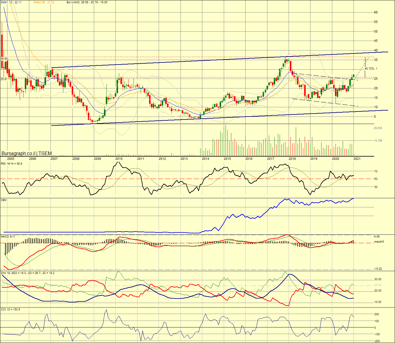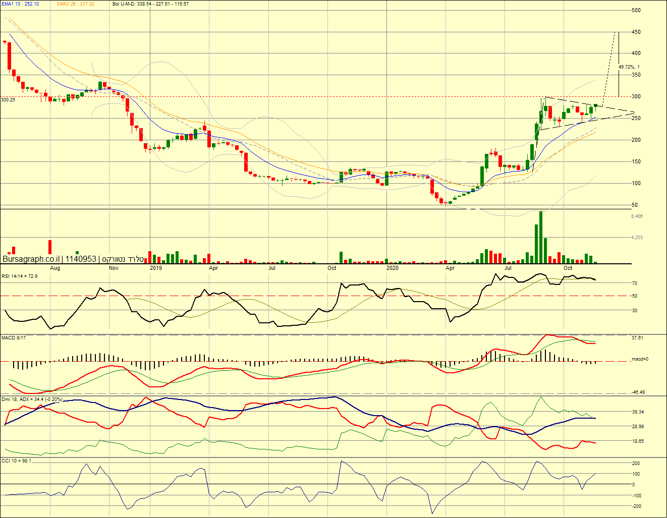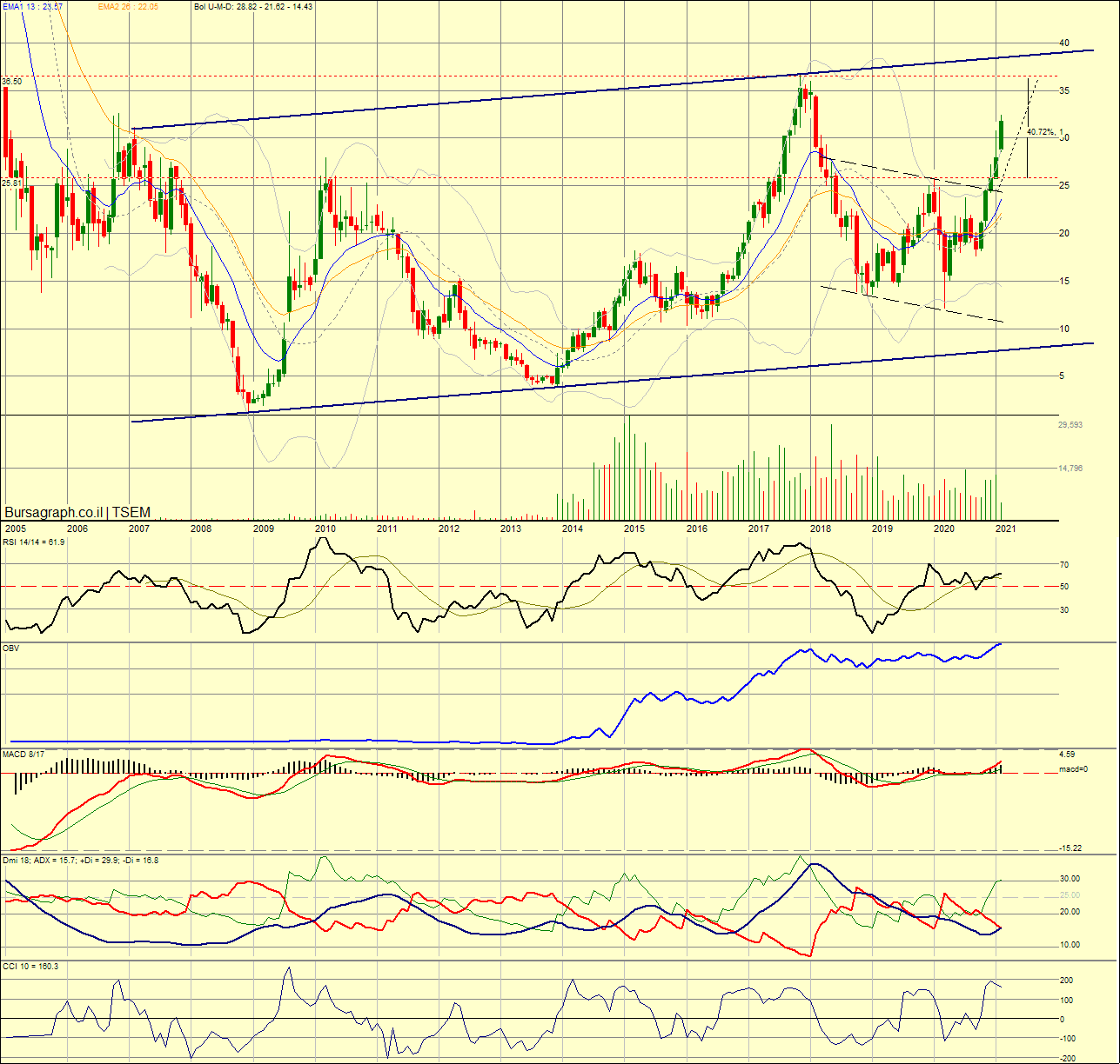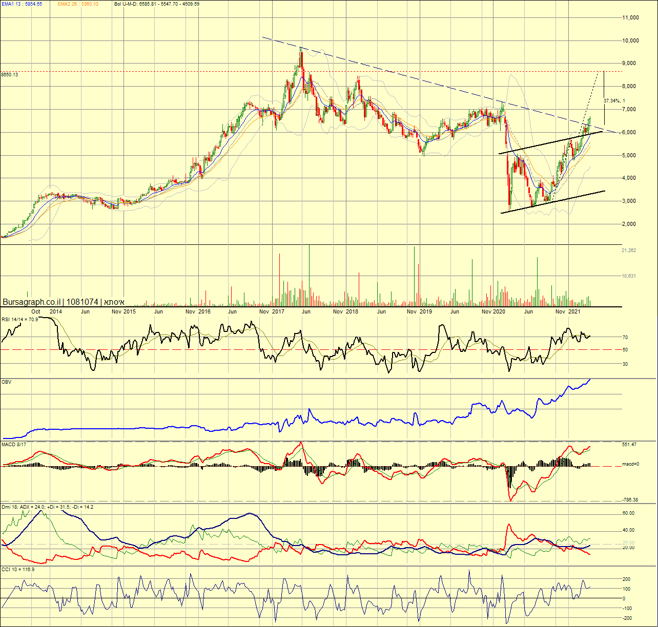 אפשרות 1: אם מצליחה לפרוץ אז תמשיך עוד כמה אחוזים קדימה ללא קושי. אפשרות 2: כישלון בפריצה, תביא לתיקון לפי תבנית M, כאשר סביר שזה יהיה בשתי מדרגות (מסומן באופקי כחול). ההכרעה לדעתי היום או מחר. נסחרת בארה"ב. מחזיק ולא ממליץ. 🤞