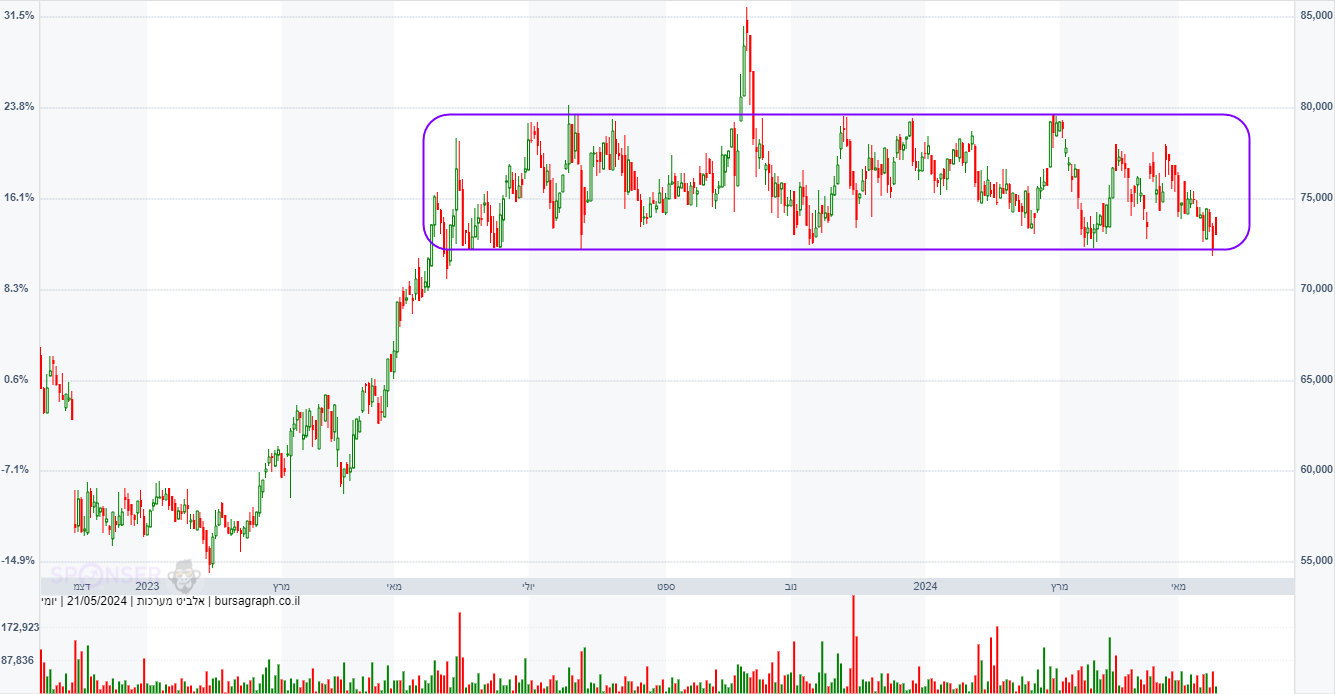 המניה מדשדשת 12 חודשים בטווח ברור, למעט יציאה נקודתית מהטווח בתאריך 10.10.23 ועד 16.10.23. מדשדשת בין 72,300 מלמטה לבין 79,500 מלמעלה למי שיש סבלנות ממתין באזור רף הדשדוש התחתון עם סטופ ברור ובציפייה לחזרה לאזורים 78,000-79,500 מי שנכנס באמצע הטווח אוכל מרור