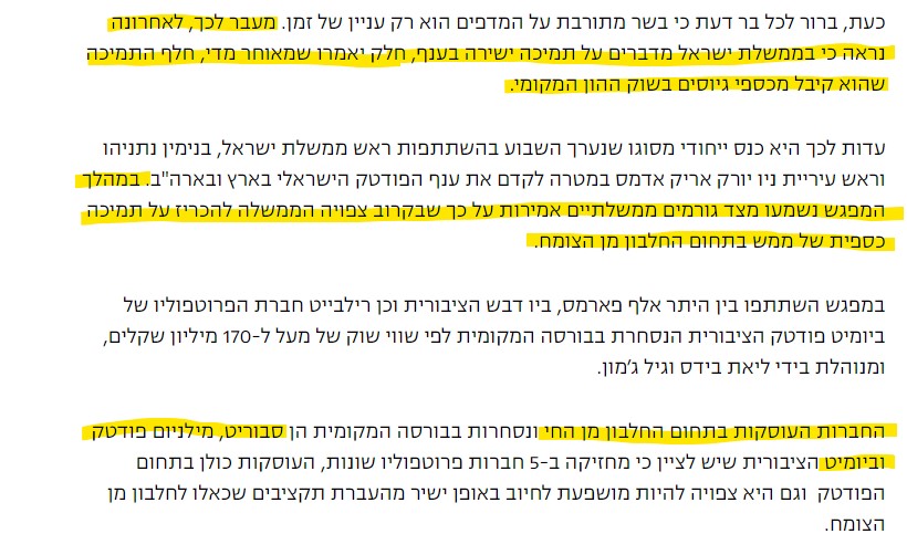 כתבה בכלכליטס. נקסטפרם, וילק, ביו דבש ו סבוריט, נכנסו לאחוזת בית ב־2020 ו־2021, משווי בשיא של מיליארד ש"ח - ירדו ל60M. ואני אומר - על כל חברות החלום. יכולות לעלות כשיש באזז, סוחרים טובים יעשו כסף - הרוב יפסיד המכנסיים. לחצו על שמות החברות ותראו מה כתבו עליהן. חבל שאי אפשר לראות מה נכתב בשיא כי אי אפשר לעשות חיפוש . ולאנשי הביומד - לפתח תרופה לוקח הרבה יותר כסף וזמן מפיתוח החלומות בפוד טק.