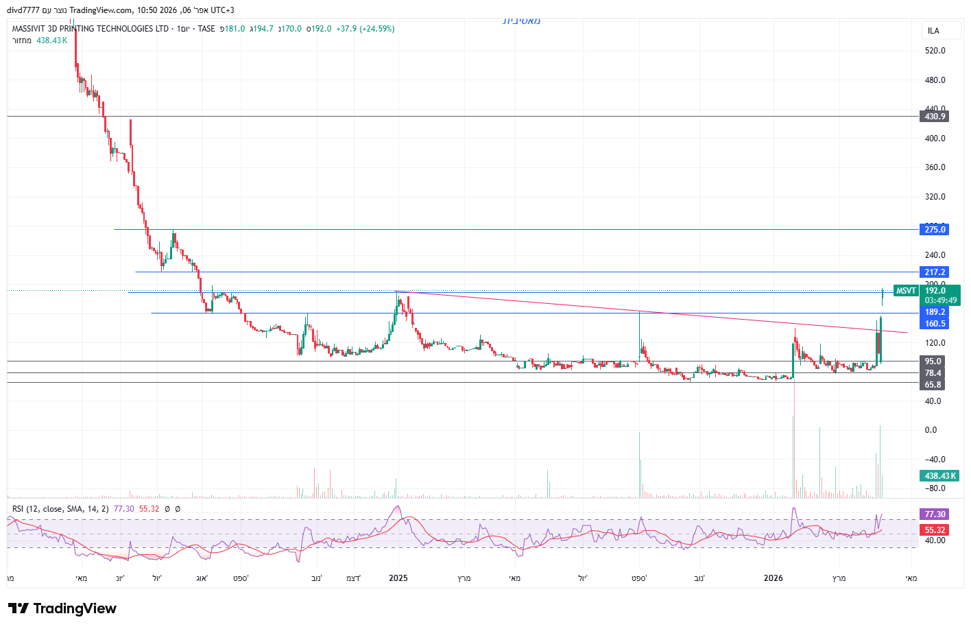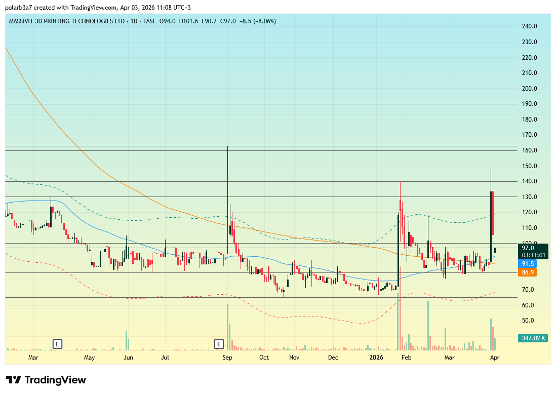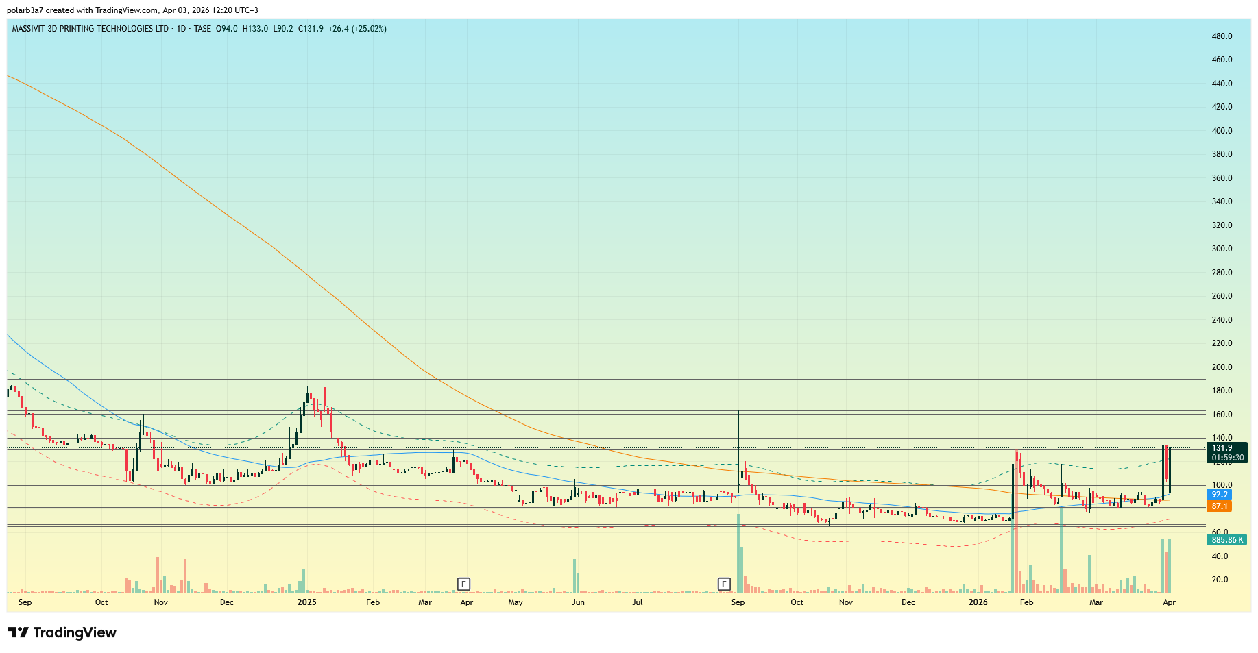 מזכר ההבנות שנחתם בין חברת מאסיבית לבין חברת קומפרטס. אולי זו הסיבה לעליות האחרונות?..., מזכר ההבנות נחתם לפי מאיה ב 3/9/25 ומאז לא יצאה הודעה מהותית בנדון ו/או ברמת הסכמים נוספים. ציטוט מתוך ההודעה: ''מזכר ההבנות קובע כי בשלב הראשון שיחל במועד החתימה על מזכר ההבנות ועד למועד הקמת לשכת השירות, החברה תספק לקומפרטס תבניות אשר תיוצרנה במדפסת מאסיבית ,10000 לצורך ייצור חלקים סופיים מחומרים מרוכבים, על ידי לקוחות של קומפרטס מהתעשייה הבטחונית בישראל, בהתאם לפירוט ולעלויות מוסכמים בין הצדדים. במסגרת השלב השני, שלפי מזכר ההבנות צפוי להתחיל ב,1.1.2026- תוקם לשכת שירות משותפת ל2- החברות. במהלך השלב הראשון ועד למועד הקמת לשכת השירות הצדדים יפעלו לחתימת הסכם סופי ומחייב להקמת לשכת השירות. חתימת הצדדים על הסכם סופי ומחייב בהמשך לחתימה על מזכר ההבנות, והקמת מרכז השירות המשותף, אינם וודאיים ועלולים שלא להתממש או להתממש בתנאים שונים מהתנאים המתוארים לעיל.'' ג.נ. מחזיק משבוע המסחר האחרון, בהסתכלות גראפית לאחור (לפני 3 שנים) המניה של החברה הייתה על שערי 800 אג' וגבוה מכך, כרגע על 185 אג' ועם שיפטינג חדש לעבר הסקטור הביטחוני. מעניינת מאד לדעתי האישית, אין לראות בנאמר כל המלצה.