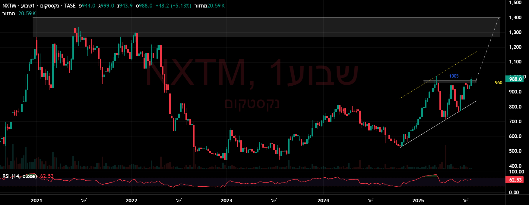 מנסה לצאת קדימה. אם יצליחו להתבסס מעל 1000, היעד לעניות דעתי לכיוון השיא. לא ביום אחד כמובן ויהיו התנגדויות בדרך. גרף שבועי.
