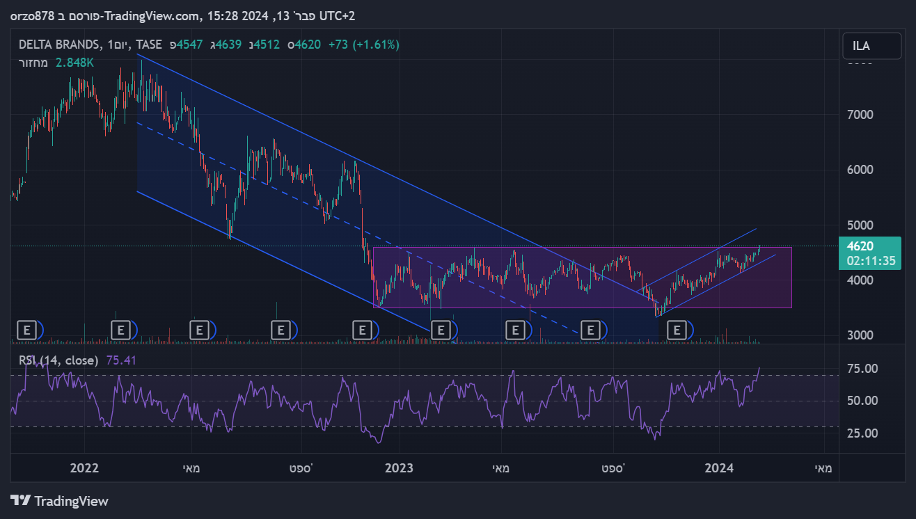 מסוג הגרפים היפים שאני אוהב לראות. תעלה יורדת נהפכה לתנועת צד עם טווח ברור. פריצה של 4600 יכולה להוציא את המניה למהלך עולה יפה. למעקב.