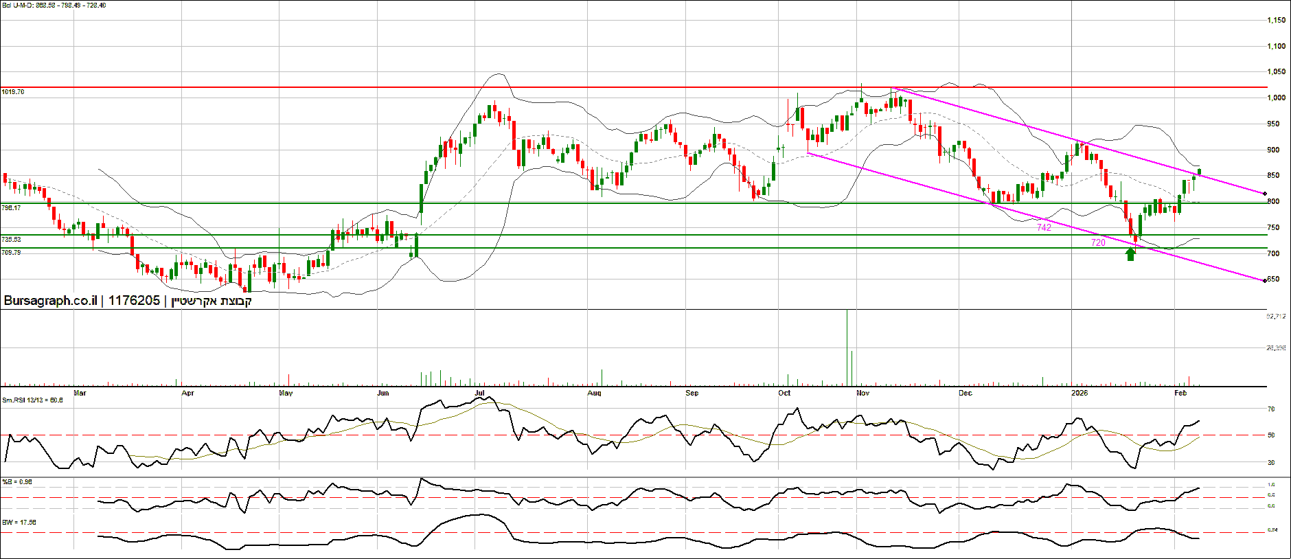 גרף זה נשלח כאן ביום בו נקבע השפל,,,,, וזה פורסם היום רינת שילה, אנליסטית במיטב ברוקראז', פרסמה אנליזה על אקרשטיין קבוצת אקרשטיין 1.91% וקבעה מחיר יעד של 10.4 ש"ח למניה, לעומת מחיר השוק הנוכחי של 7.8 ש"ח – פער של 33%. שילה המליצה על "משקל יתר". הדוח מבוסס על כניסה לפעילות של מספר מפעלים חדשים במהלך 2026 ו-2027, תקציבים ממשלתיים משמעותיים לתשתיות ומיגון, ופוטנציאל בפרויקטי נדל"ן שבתכנון.