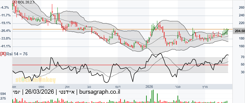 מנייה מייאשת האמת - אבל מתחילה לטפס אט אט מעלה. כל יום נסגרת בגבוה יותר מאתמול. גילוי נאות: תקוע בהפסד שהולך ומצטמצם, אבל מאמין במנייה הזו ובחברה שאני רואה את הפעילות שלה בבתי חולים בארץ (ויש לה גם פעילות חו"ל) מבצבצת מעלה מרצועת הבולינגר ו RSI גבוה מאוד. להערכתי תמשיך יפה לטפס. לא ממליץ, רק מאיר עליה לשיקולכם.