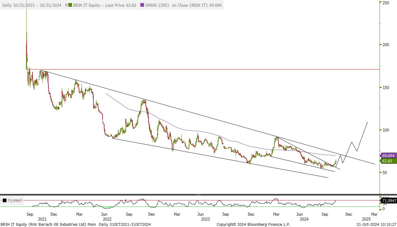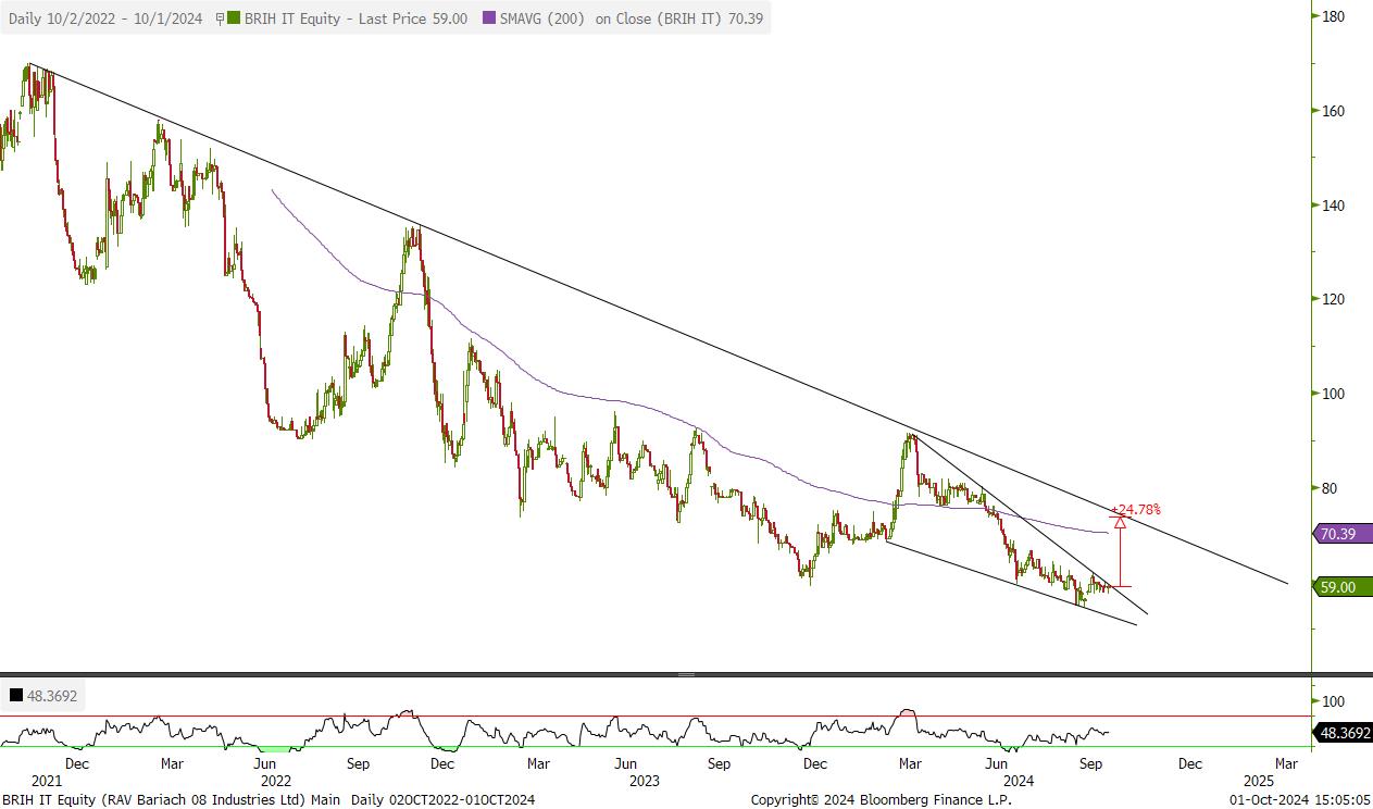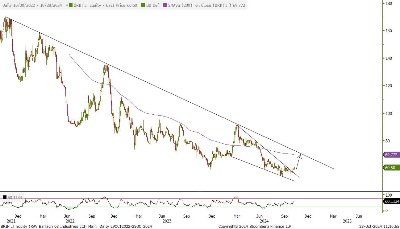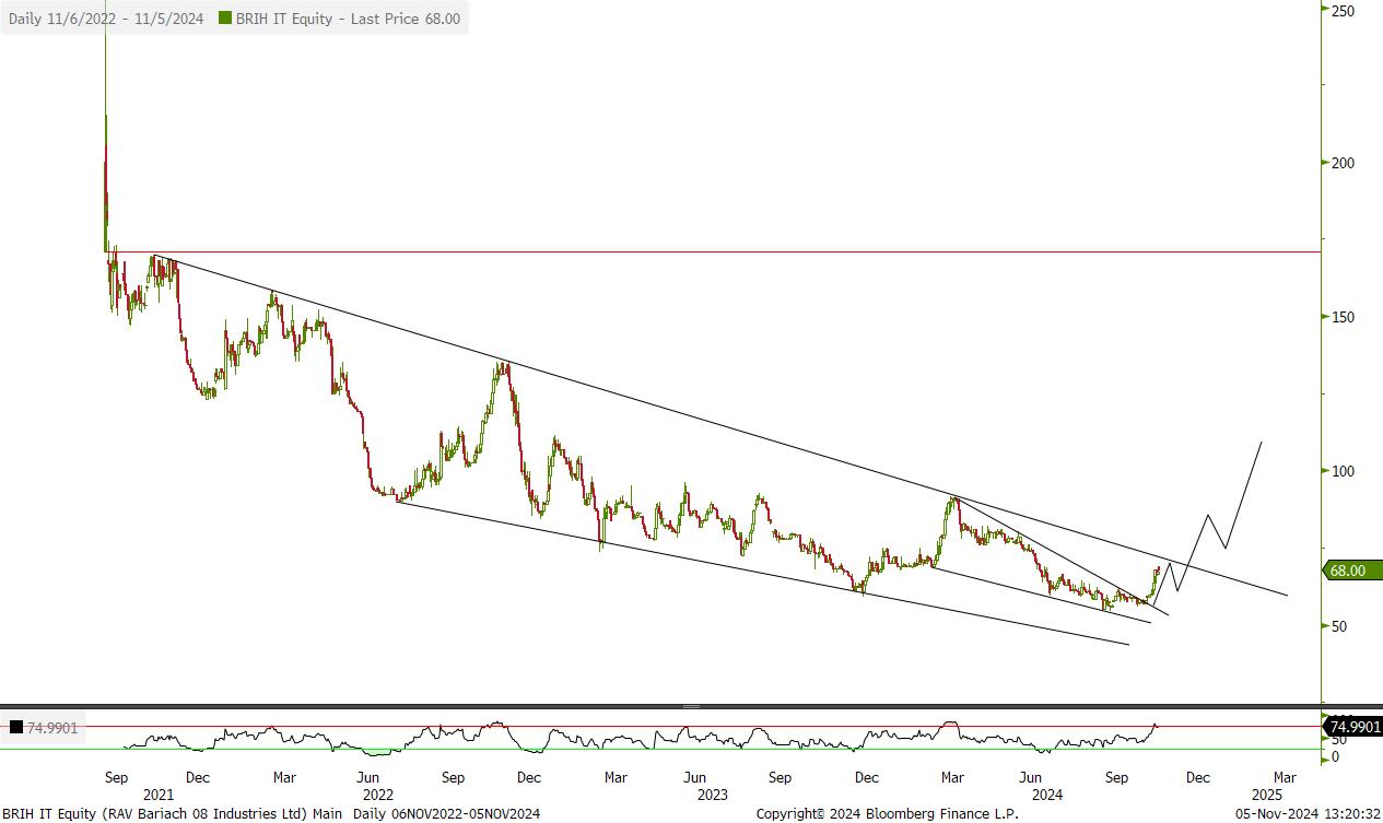 מניה לא נזילה עם אחוז אחזקה קטן של הציבור. החברה אמורה להנות מהיום שאחרי המלחמה ומתומחרת יחסית בזול. פריצה של אזור 60 יכול להוביל לאזור 75.