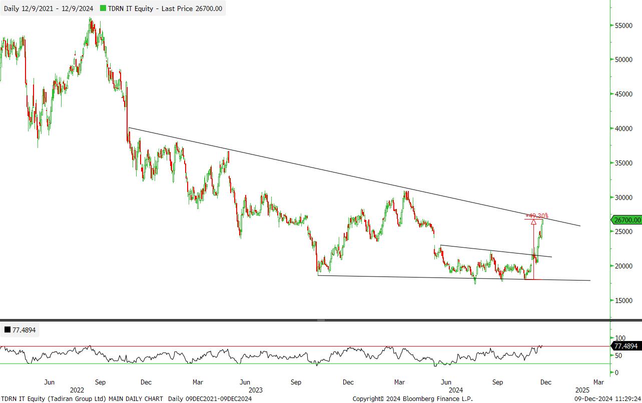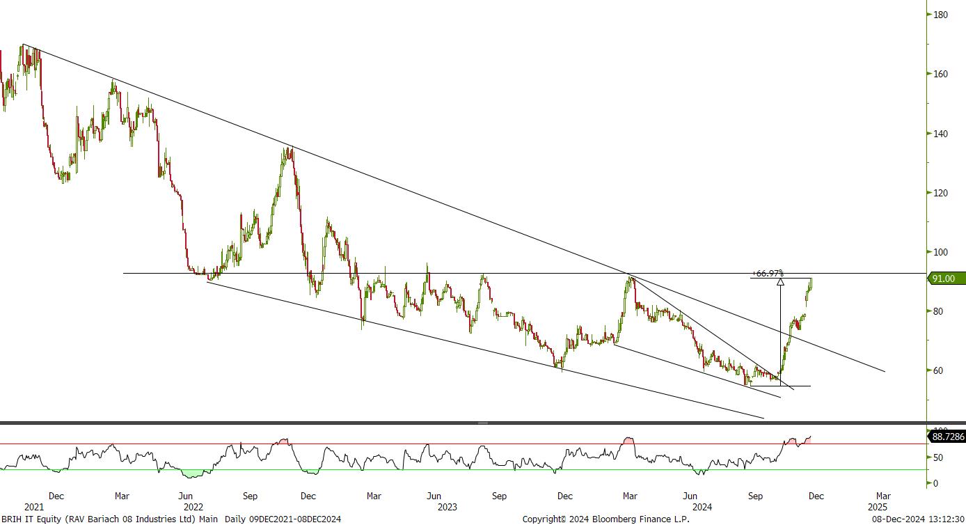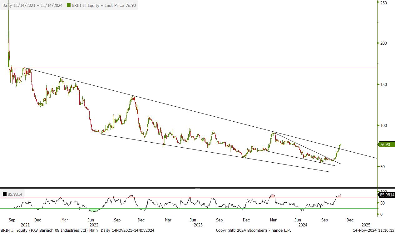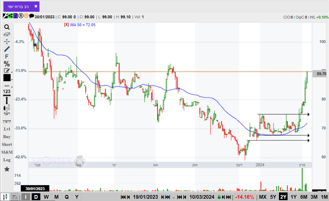 מניה לא נזילה עם אחוז אחזקה קטן של הציבור. החברה אמורה להנות מהיום שאחרי המלחמה ומתומחרת יחסית בזול. פריצה של אזור 60 יכול להוביל לאזור 75.