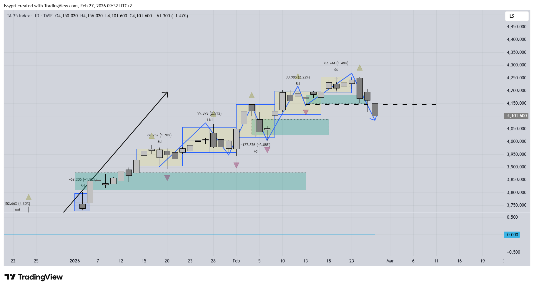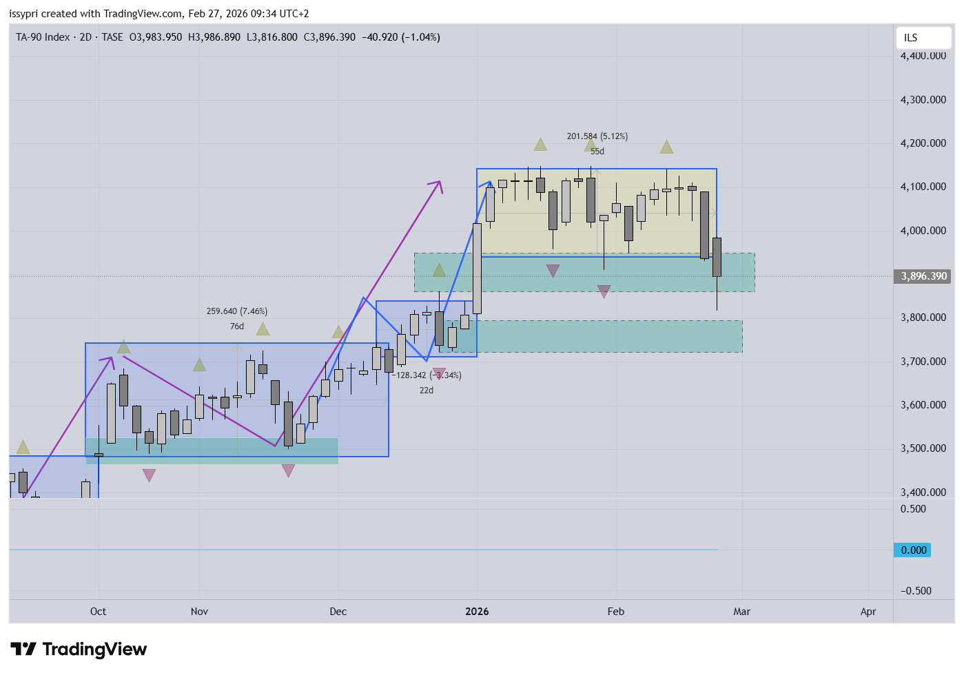 ממליץ מאוד לכל מי שמתנתח להוריד כלי אובייקטיבי שנקרא פרקטלים. הוא מסמן נקודות קיצון. (המשולשים הסגולים והירוקים שהיו מסודרים בסדר עולה) במדד תא 35 אכן נשבר שפל עולה. בשלב ראשון זה מראה שינוי מומנטום. שלב שני נצטרך לראות אזורי איזון בסדר יורד כדי להשלים את התמונה ולקבוע שהמדמה הפכה ליורדת. המשמעות של שבירת שפעל עולה - שבירה של המקום האחרון ממנון דחפו הקונים. כלומר - המוכרים דומננטיים או במילים אחרות - מחפשים קונים ואין מספיק כאלו.
