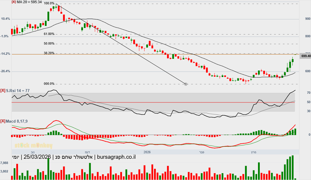 וזאת בזמן שכלל השוק אדום.... עוד קצת ותחצה נקודה מעניינית (מצ"ב בצהוב) של שילוב של 3 אינדיקטורים - פיבו 38%, ממוצע נע 200, ממוצע נע 100... וכמובן האפקט הפסיכולוגי של חציית שער 700.
