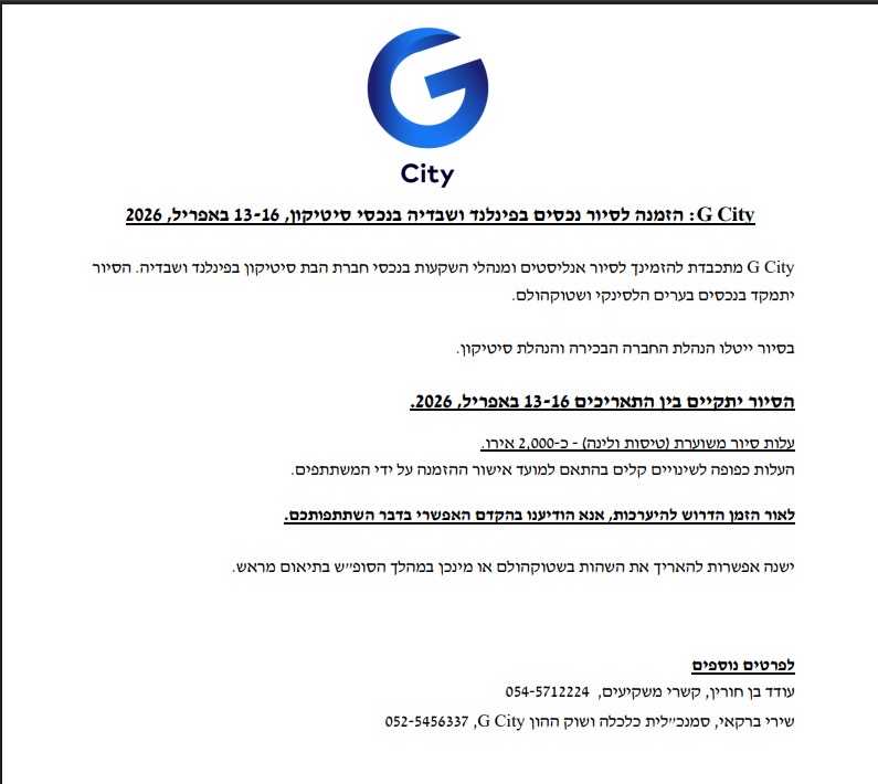 ג'י סיטי אירופה, חברת הבת בבעלות מלאה של ג'י סיטי, פרסמה את תוצאותיה לרבעון הרביעי ושנת 2025. החברה מציגה תוצאות תפעוליות חזקות ושיפור מתמשך בכל הפרמטרים. דגשים לתוצאות הרבעון הרביעי של שנת 2025: ה-NOI מנכסים זהים עלה ברבעון בכ-26.1% לעומת הרבעון המקביל אשתקד. במהלך הרבעון נחתמו חידושי חוזים בעליה ממוצעת של כ-5% בשכ"ד הממוצע למ"ר. פדיונות השוכרים בנכסים זהים עלו ברבעון ב-1.4% לעומת הרבעון המקביל אשתקד. תיק הנכסים של החברה רשם במהלך הרבעון שיערוך חיובי נטו של כ-15 מיליון אירו. דגשים לתוצאות שנת 2025: ה-NOI מנכסים זהים עלה במהלך השנה בכ-19.3% לעומת אשתקד. במהלך השנה נחתמו חידושי חוזים בעלייה ממוצעת של כ-13.4% בשכ"ד הממוצע למ"ר. פדיונות השוכרים בנכסים זהים עלו ב-2.1% לעומת אשתקד. תנועת המבקרים בנכסים זהים עלתה במהלך השנה ב-2.1% לעומת אשתקד. שעור התפוסה שמר על רמתו הגבוהה ועמד לסוף שנת 2025 על 95.8%. תיק הנכסים של החברה רשם במהלך השנה שיערוך חיובי נטו של כ-56 מיליון אירו. בדצמבר 2025 הכריזה החברה על דיבידנד בסך של כ-90 מיליון אירו (כ-0.30 אירו למניה) ששולם בינואר 2026.
